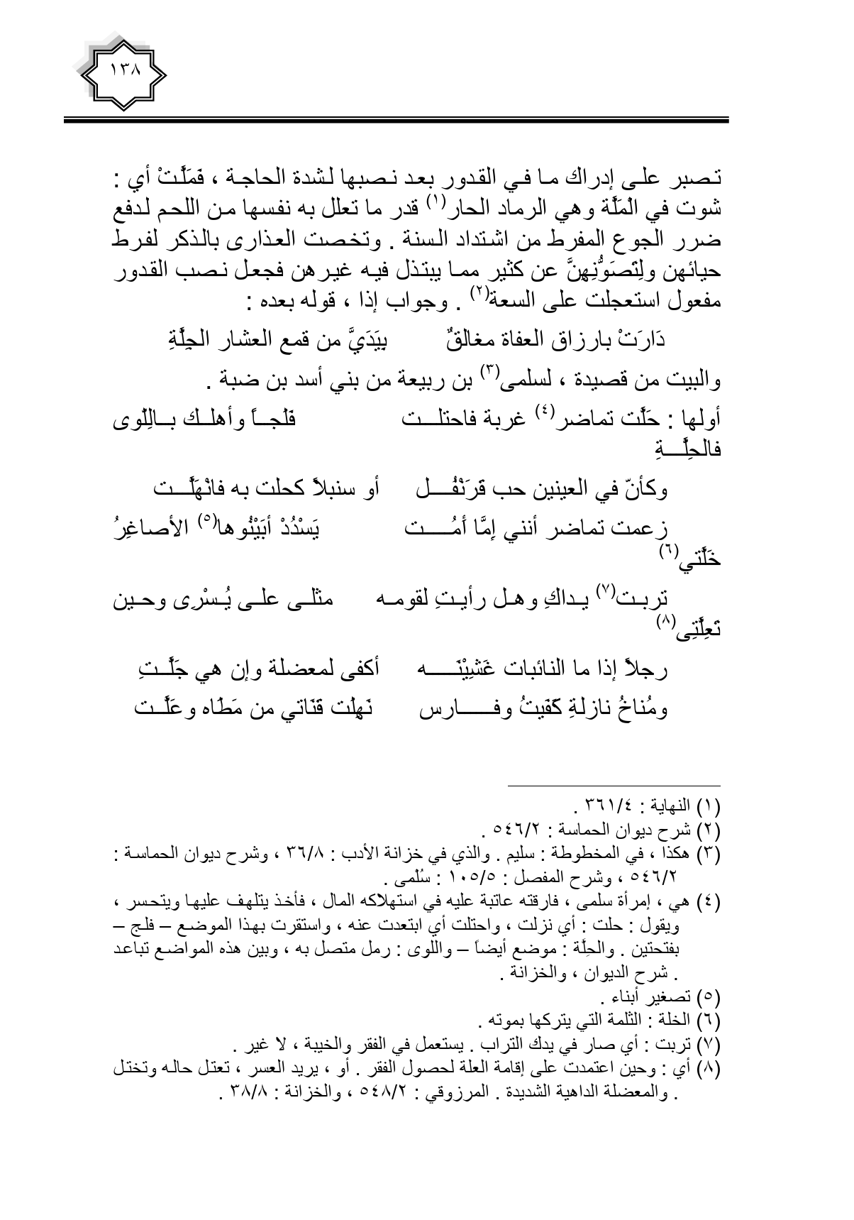 تصبر على إدراك ما في القدور بعد نصبها لشدة الحاجة، فملت أي: شوت في الملة وهو الرماد الحار قدر ما تعلل به نفسها من اللحم لدفع ضرر الجوع المفرط من اشتداد السنة. وتخصت العذارى بالذكر لفرط حياتهن ولتصونهن عن كثير مما يبتذل فيه غير هن فجعل نصب القدور مفعول استعجلت على السعة. وجواب إذا، قوله بعده:
