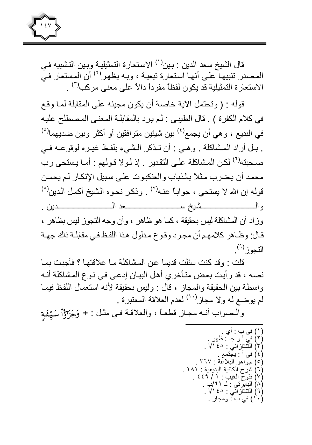 قلت: وقد كنت سئلت قديما عن المشاكلة ما علاقتها؟ فأجبت بما نصه، قد رأيت بعض متأخري أهل البيان إدعى في نوع المشاكلة أنه واسطة بين الحقيقة والمجاز، قال: وليس بحقيقة لأنه استعمال اللفظ فيما لم يوضع له ولا مجاز لعدم العلاقة المعتبرة.