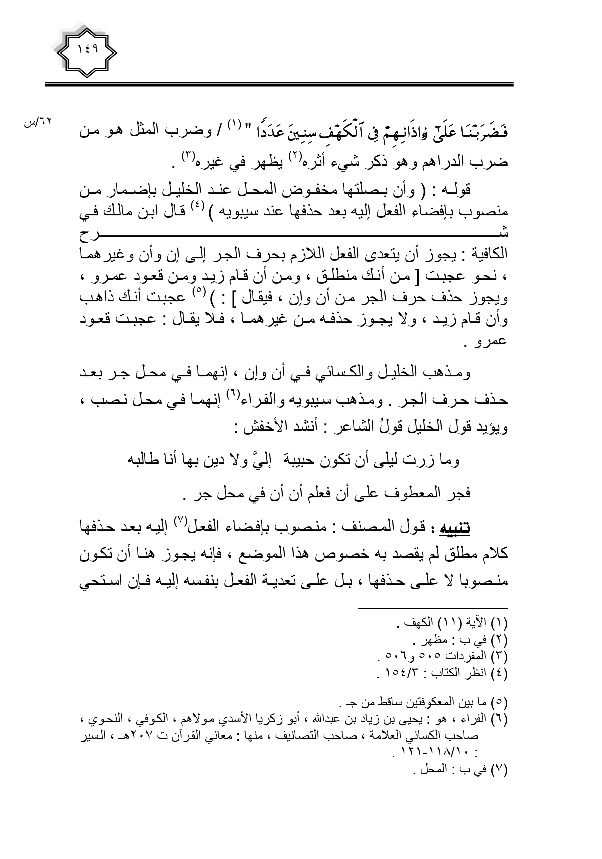 تنبيه: قول المصنف: منصوب بإفضاء الفعل إليه بعد حذفها كلام مطلق لم يقصد به خصوص هذا الموضع، فإنه يجوز هنا أن تكون منصوبا لا على حذفها، بل على تعدية الفعل بنفسه إليه فإن استحي