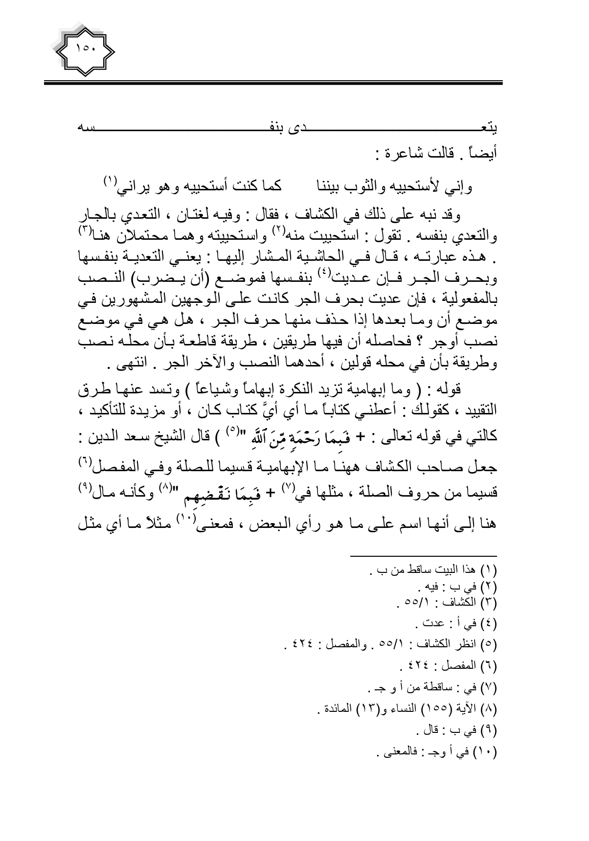 وقد نبه على ذلك في الكشاف، فقال: وفيه لغتان، التعدي بالجار والتعدي بنفسه. تقول: استحييت منه واستحييته وهما محتملان هنا. هذه عبارته، قال في الحاشية المشار إليها: يعني التعدية بنفسها وبحرف الجر فإن عديت بنفسها فموضع (أن يضرب) النصب بالمفعولية، فإن عديت بحرف الجر كانت على الوجهين المشهورين في موضع أن وما بعدها إذا حذف منها حرف الجر، هل هي في موضع نصب أو جر؟ فحاصله أن فيها طريقين، طريقة قاطعة بأن محله نصب وطريقة بأن في محله قولين، أحدهما النصب والآخر الجر. انتهى.