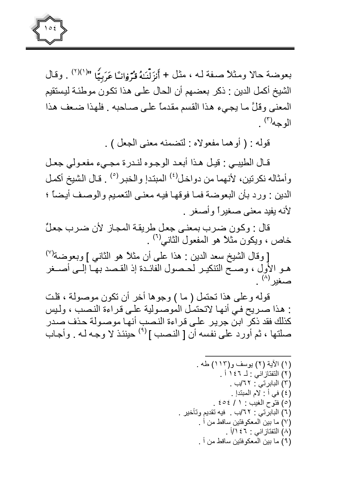 قوله وعلى هذا تحتمل (ما) وجوها أخر أن تكون موصولة، قلت: هذا صريح في أنها لا تحتمل المحصولية على قراءة النصب، وليس كذلك فقد ذكر ابن جرير عدم قراءة النصب أنها موصولة حذف صدر صلتها، ثم أورد على نفسه أن [النصب] حينئذ لا وجه له. وأجاب