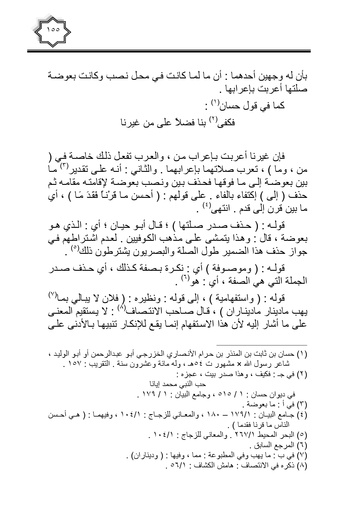فإن غيرنا أعربت بإعراب من، والعرب تفعل ذلك خاصة في (من، وما)، تعرب صلاتهما بإعرابهما. والثاني: أنه على تقدير ما بين بعوضة إلى ما فوقها فحذف بين ونصب بعوضة لإقامته مقامه ثم حذف (إنى) إكتفاء بالفاء. على قولهم. (أحسن ما قرنا فقد ما)، أي ما بين قرن إلى قدم. انتهى.