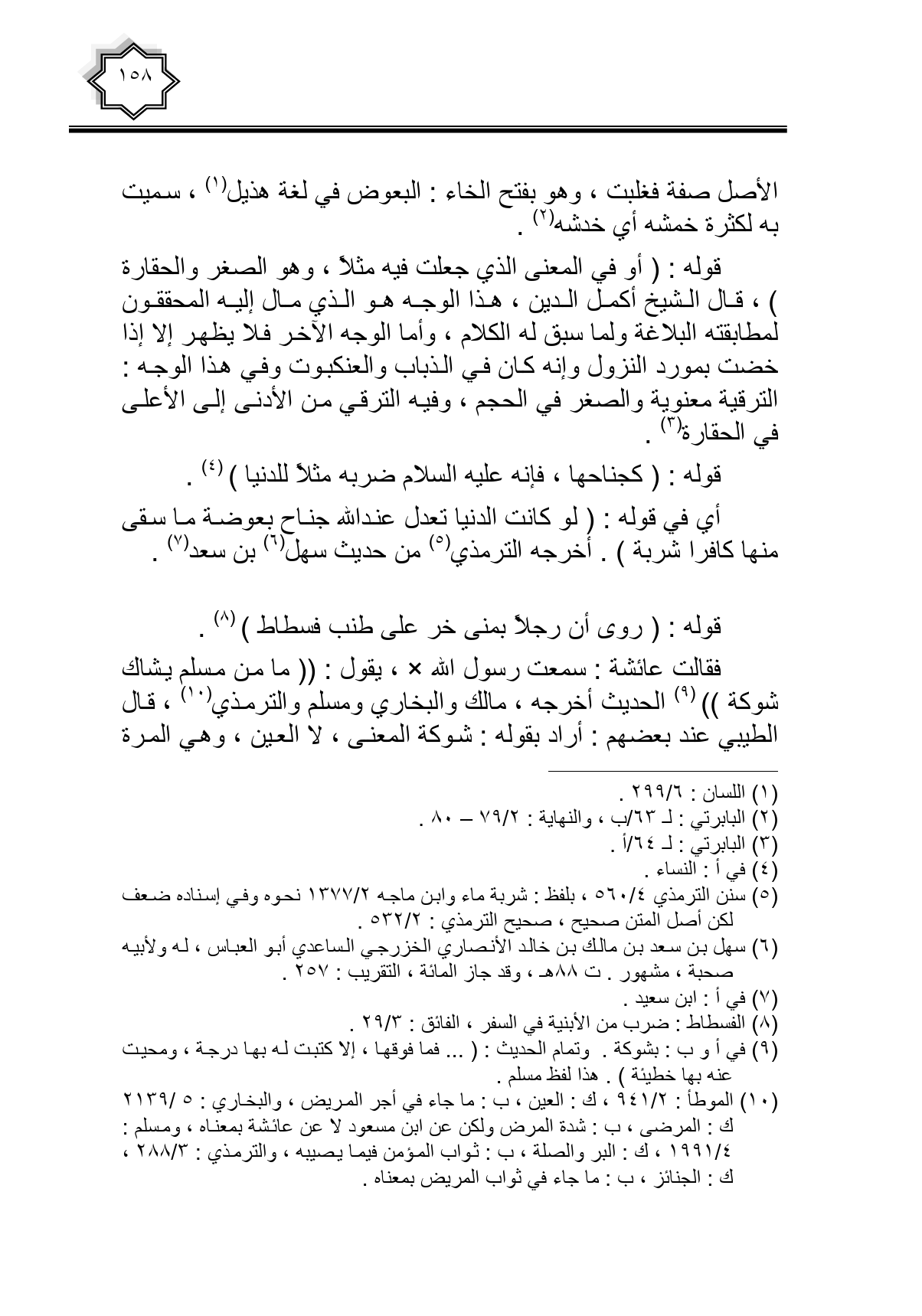 فقالت عائشة: سمعت رسول الله - صلى الله عليه وسلم -، يقول: ((ما من مسلم يشاك شوكة)) الحديث أخرجه، مالك والبخاري ومسلم والترمذي، قال الطيبي عند بعضهم: أراد بقوله: شوكة المعنى، لا العين، وهي المرة