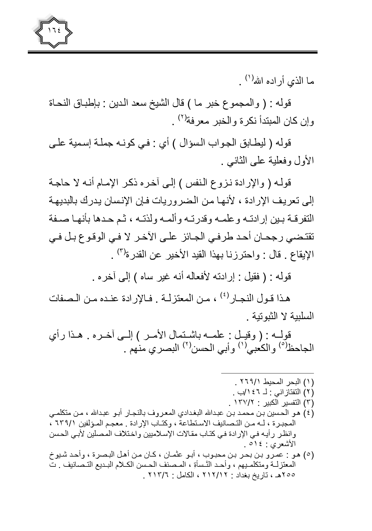هذا قول النجار، من المعتزلة. فالإرادة عنده من الصفات السلبية لا الثبوتية.