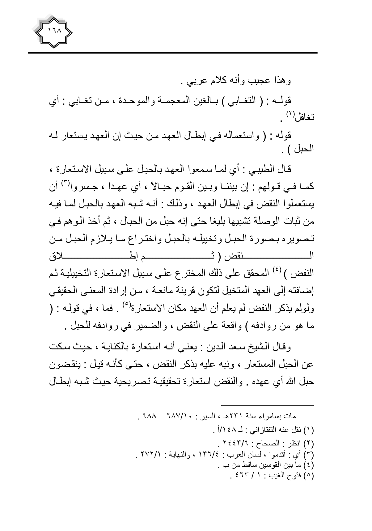 قوله: (واستعماله في إبطال العهد من حيث أن العهد يستعار له الحبل).