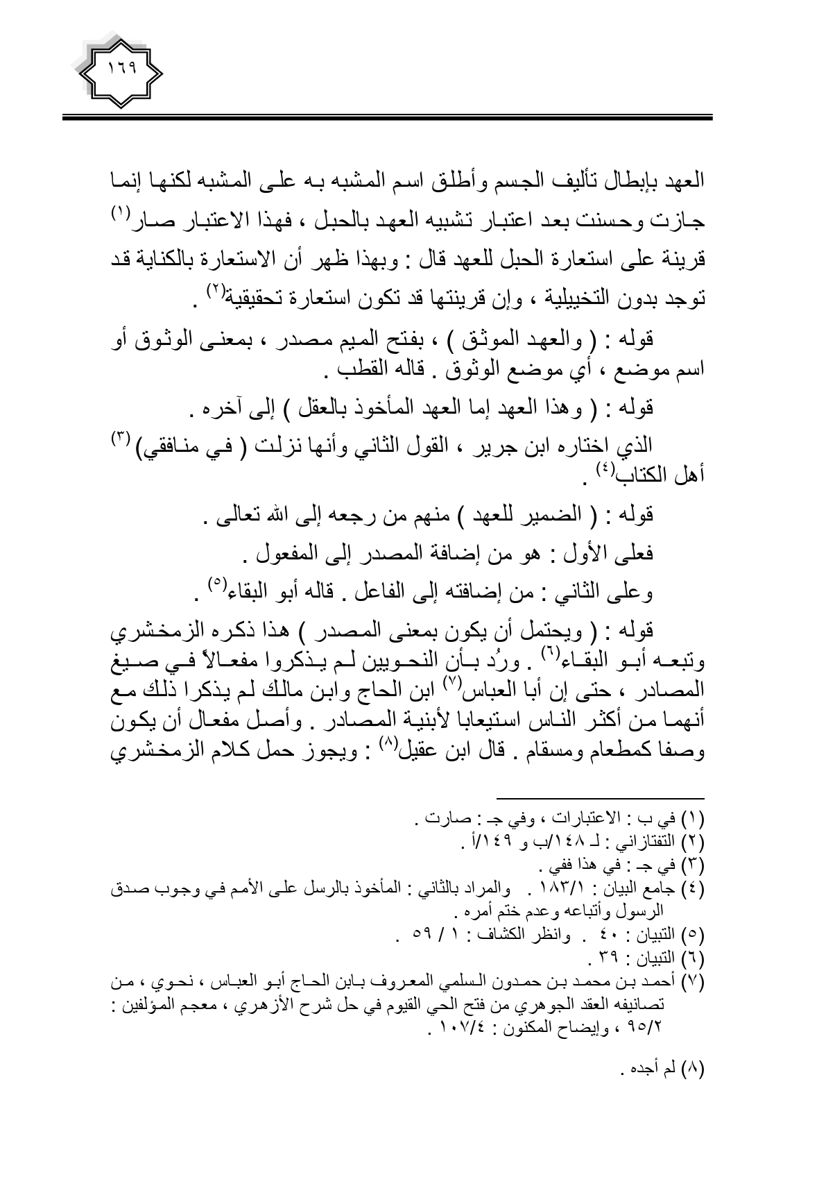 العهد بإبطال تأليف الجسم وأطلق اسم المشبه به على المشبه لكنها إنما جازت وحسنت بعد اعتبار تشبيه العهد بالحبل، فهذا الاعتبار صار قرينة على استعارة الحبل للعهد قال: وبهذا ظهر أن الاستعارة بالكناية قد توجد بدون التخييلية، وإن قرينتها قد تكون استعارة تحقيقية.