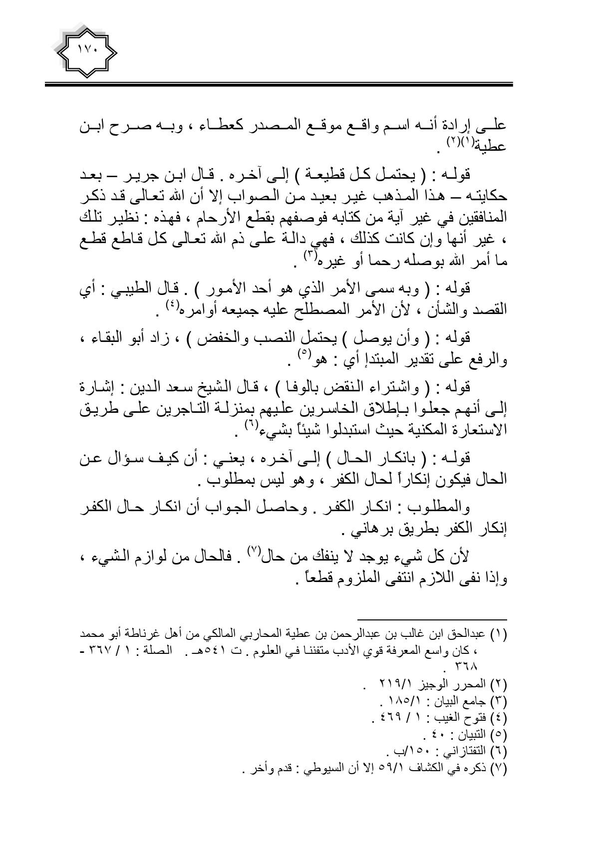 قوله: (يحتمل كل قطيعة) إلى آخره. قال ابن جرير - بعد حكايته- هذا المذهب غير بعيد من الصواب إلا أن الله تعالى قد ذكر المنافقين في غير آية من كتابه فوصفهم بقطع الأرحام، فهذه: نظير تلك، غير أنها وإن كانت كذلك، فهي دالة على ذم الله تعالى كل قاطع قطع ما أمر الله بوصله رحما أو غيره.