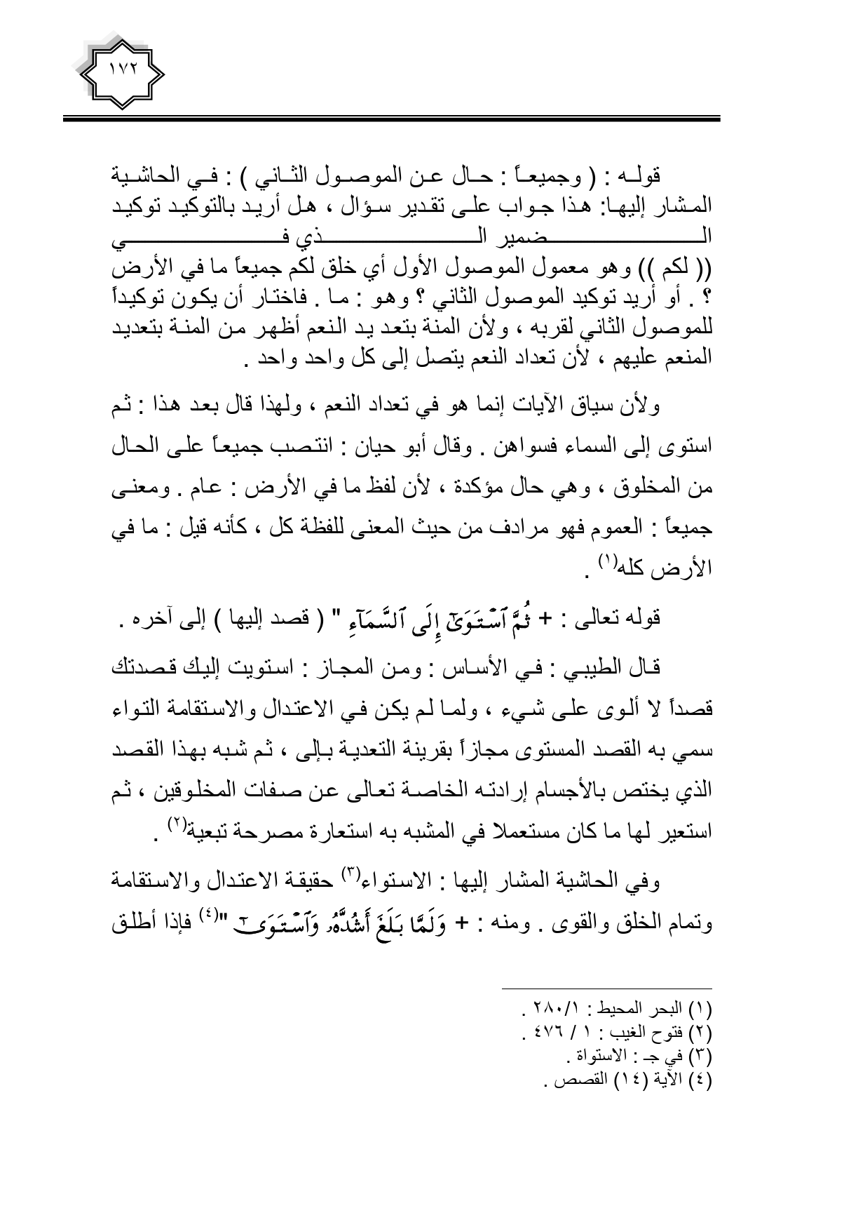قوله: (وجميعا: حال عن الموصول الثاني): في الحاشية المشار إليها: هذا جواب على تقدير سؤال، هل أريد بالتوكيد توكيد الضمير الذي في ((لكم)) وهو معمول الموصول الأول أي خلق لكم جميعا ما في الأرض؟. أو أريد توكيد الموصول الثاني؟ وهو: ما. فاختار أن يكون توكيداً للموصول الثاني لقربه، ولأن المنة بتعد يد النعم أظهر من المنة بتعديد المنعم عليهم، لأن تعداد النعم يتصل إلى كل واحد واحد.