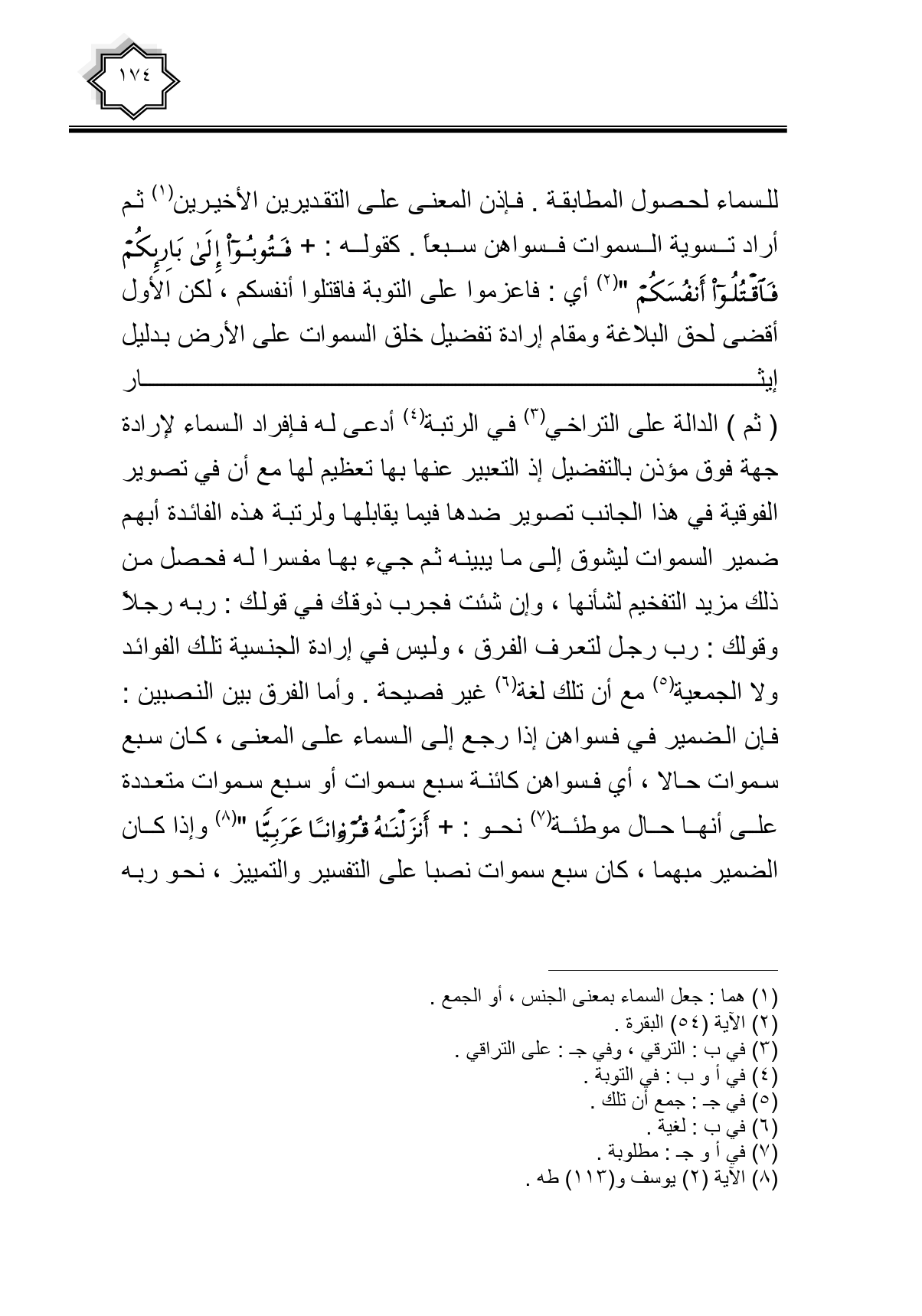 للسماء لحصول المطابقة. فإذن المعنى على التقديرين الأخيرين ثم أراد تسوية السموات فسواهن سبعا. كقوله: {فَتُوبُوا إِلَى بَارِئِكُمْ فَاقْتُلُوا أَنْفُسَكُمْ} أي: فاعزموا على التوبة فاقتلوا أنفسكم، لكن الأول أقضى لحق البلاغة ومقام إرادة تفضيل خلق السموات على الأرض بدليل