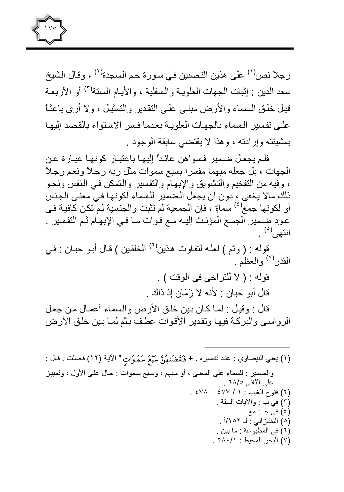 رجلا نص على هذين النصبين في سورة حم السجدة، وقال الشيخ سعد الدين: إثبات الجهات العلوية والسفلية: والأيام الستة أو الأربعة قبل خلق السماء والأرض مبنى عدى التقدير والتمثيل، ولا أرى باعثا على تفسير السماء بالجهات العلوية بعدما فسر الاستواء بالقصد إليها بمشيئته وإرادته، وهذا لا يقتضي سابقة الوجود.