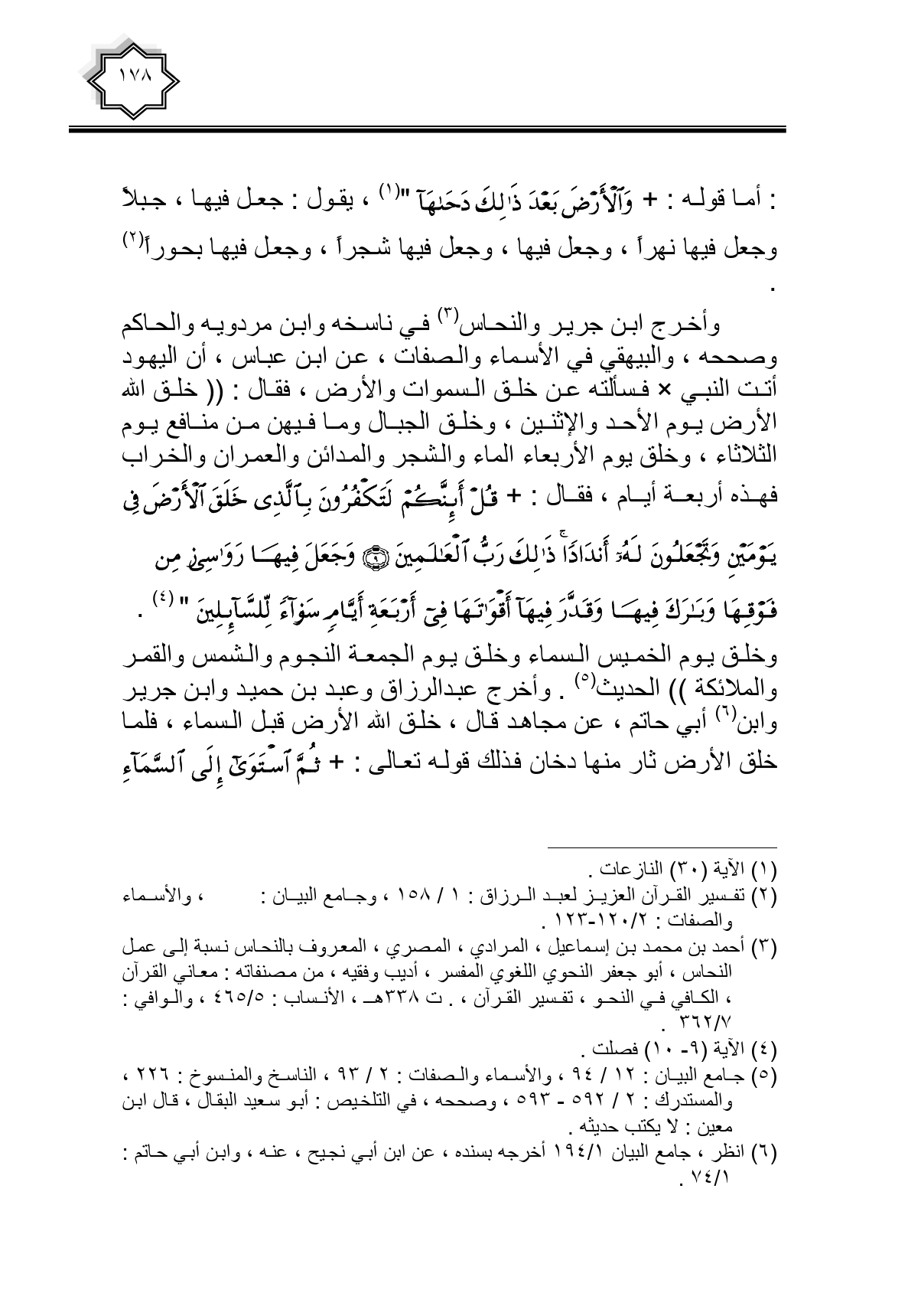 وأخرج ابن جرير والنحاس في ناسخه وابن مردويه والحاكم وصححه، والبيهقي في الأسماء والصفات، عن ابن عباس، أن اليهود أتت النبي - صلى الله عليه وسلم - فسألته عن خلق السموات والأرض، فقال: ((خلق الله الأرض يوم الأحد والاثنين، وخلق الجبال وما فيهن من منافع يوم الثلاثاء، وخلق يوم الأربعاء الماء والشجر والمدائن والعمران والخراب فهذه أربعة أيام، فقال: {قُلْ أَئِنَّكُمْ لَتَكْفُرُونَ بِالَّذِي خَلَقَ الْأَرْضَ فِي يَوْمَيْنِ وَتَجْعَلُونَ لَهُ أَنْدَادًا ذَلِكَ رَبُّ الْعَالَمِينَ (9) وَجَعَلَ فِيهَا رَوَاسِيَ مِنْ فَوْقِهَا وَبَارَكَ فِيهَا وَقَدَّرَ فِيهَا أَقْوَاتَهَا فِي أَرْبَعَةِ أَيَّامٍ سَوَاءً لِلسَّائِلِينَ}.