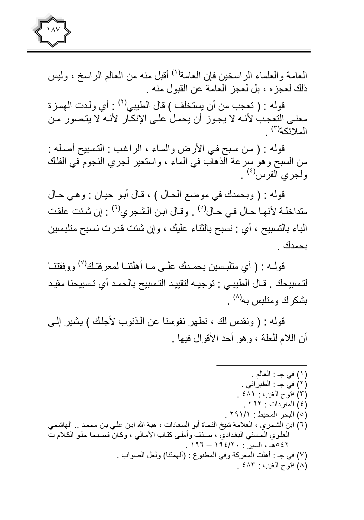 قوله: (أي متلبسين بحمدك على ما أهلتنا لمعرفتك ووفقتنا لتسبيحك. قال الطيبي: توجيه لتقييد التسبيح بالحمد أي تسبيحنا مقيد بشكرك ومتلبس به.