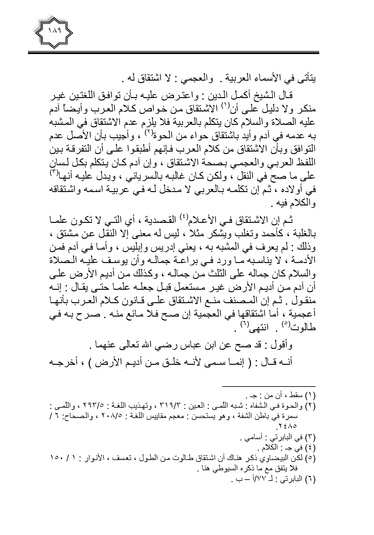 قال الشيخ أكمل الدين: واعترض عليه بأن توافق اللغتين غير منكر ولا دليل على أن الاشتقاق من خواص كلام العرب وأيضا آدم عليه الصلاة والسلام كان يتكلم بالعربية فلا يلزم عدم الاشتقاق في المشبه به عدمه في آدم وأيد باشتقاق حواء من الحوة، وأجيب بأن الأصل عدم التوافق وبأن الاشتقاق من كلام العرب فإنهم أطبقوا على أن التفرقة بين اللفظ العربي والعجمي بصحة الاشتقاق، وإن آدم كان يتكلم بكل لسان على ما صح في النقل، ولكن كان غالبه بالسرياني، ويدل عليه أنها في أولاده، ثم إن تكلمه بالعربي لا مدخل له في عربية اسمه واشتقاقه والكلام فيه.