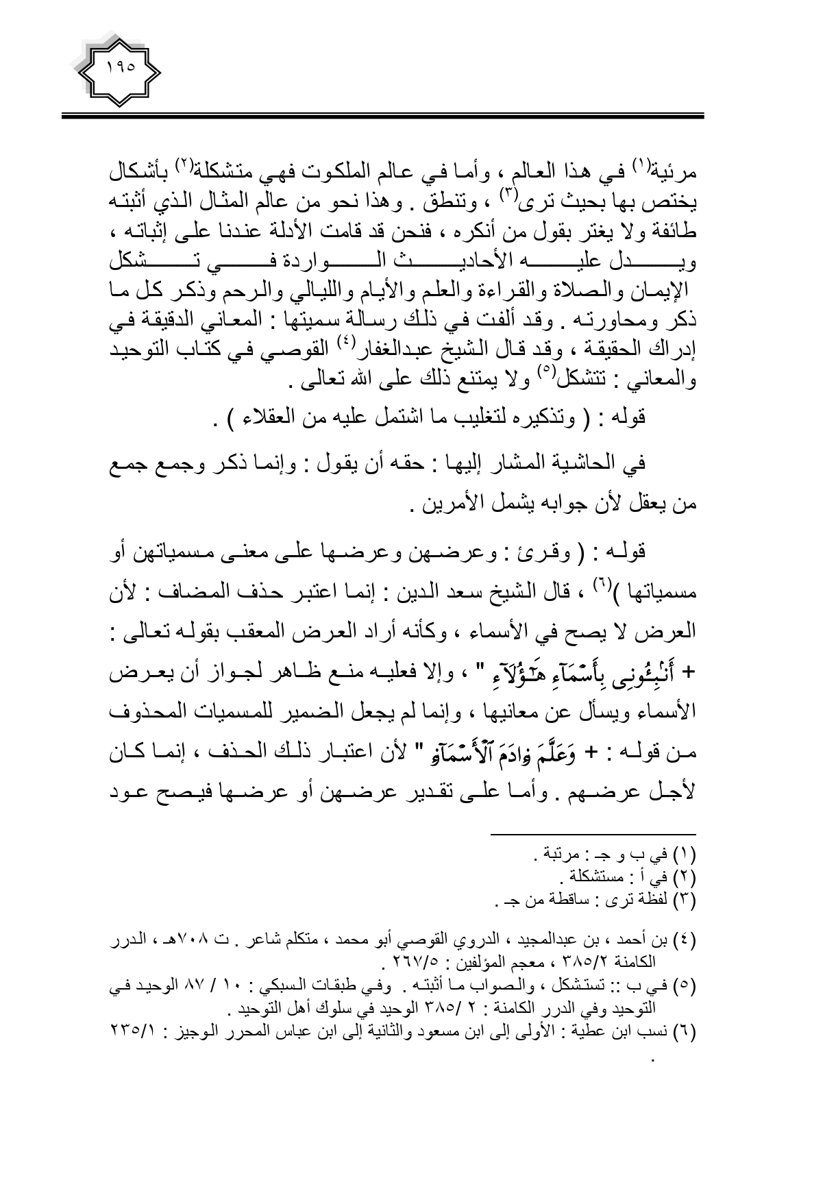 مرئية في هذا العالم، وأما في عالم الملكوت فهي متشكلة بأشكال يختص بها بحيث ترى، وتنطق. وهذا نحو من عالم المثال الذي أثبته طائفة ولا يغتر بقول من أنكره، فنحن قد قامت الأدلة عندنا على إثباته، ويدل عليه الأحاديث الواردة في تشكل الإيمان والصلاة والقراءة والعلم والأيام والليالي والرحم وذكر كل ما ذكر ومحاورته. وقد ألفت في ذلك رسالة سميتها: المعاني الدقيقة في إدراك الحقيقة، وقد قال الشيخ عبد الغفار القوصي في كتاب التوحيد والمعاني. تتشكل ولا يمتنع لك على الله تعالى.