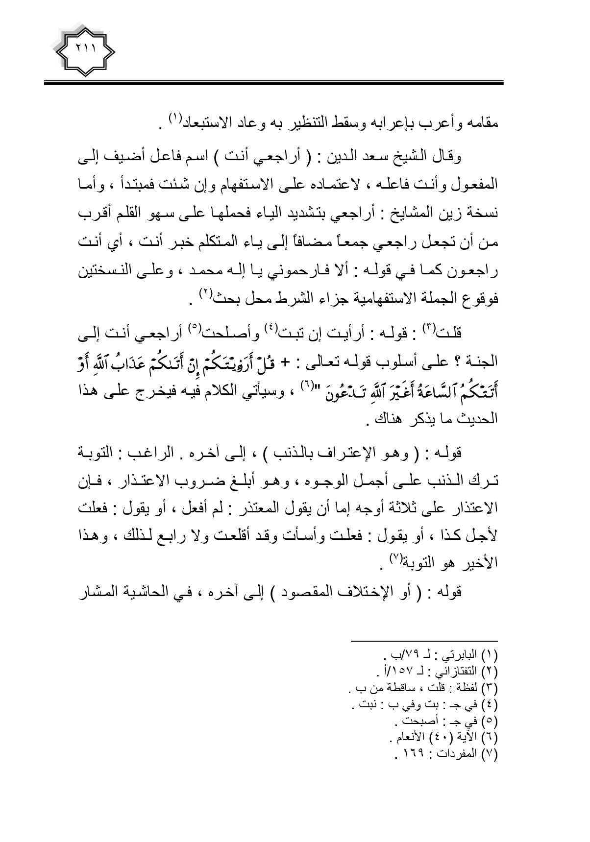 وقال الشيخ سعد الدين: (أراجعي أنت) اسم فاعل أضيف إلى المفعول وأنت فاعله، لاعتماده على الاستفهام وإن شئت فمبتدأ، وأما نسخة زين المشايخ: أراجعي بتشديد الياء فحملها على سهو القلم أقرب من أن تجعل راجعي جمعا مضافا إلى ياء المتكلم خبر أنت، أي أنت راجعون كما في قوله. ألا فارحموني يا إله محمد، وعلى النسختين فوقوع الجملة الاستفهامية جزاء الشرط محل بحث.