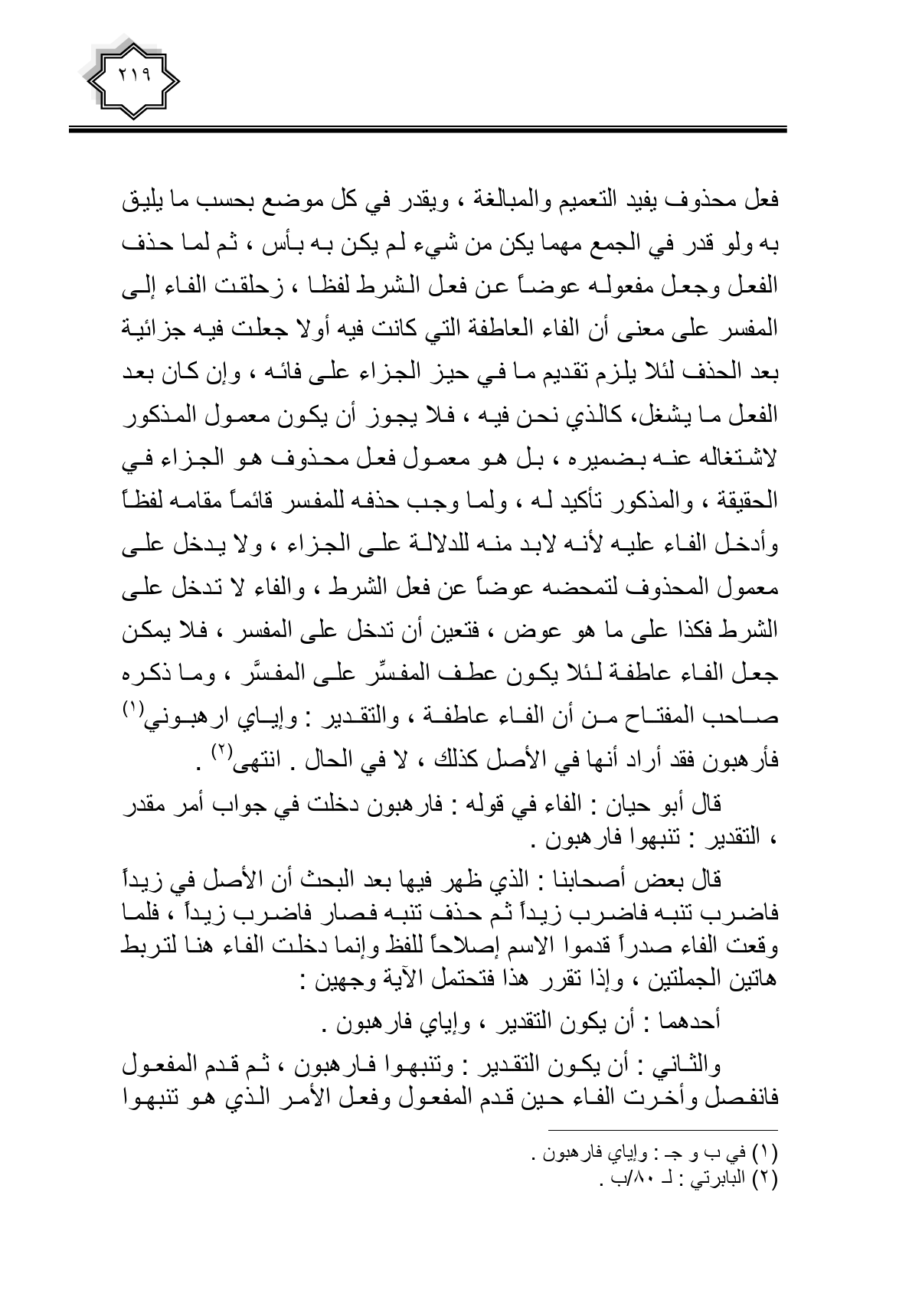 فعل محذوف يريد التعميم والمبالغة، ويقدر في كل موضع بحسب ما يليق به ولو قدر في الجمع مهما يكن من شيء لم يكن به بأس، ثم لما حذف الفعل وجعل مفعوله عوضا عن فعل الشرط لفظا، زحلقت الفاء إلى المفسر على معنى أن الفاء العاطفة التي كانت فيه أولا جعلت فيه جزائية بعد الحذف لئلا يلزم تقديم ما في حيز الجزاء على فائه، وإن كان بعد الفعل ما يشغل، كالذي نحن فيه، فلا يجوز أن يكون معمول المذكور لاشتغاله عنه بضميره، بل هو معمول فعل محذوف هو الجزاء في الحقيقة، والمذكور تأكيد له، ولما وجب حذفه للمفسر قائما مقامه لفظا وأدخل الفاء عليه لأنه لابد منه الدلالة على الجزاء، ولا يدخل على معمول المحذوف لتمحضه عوضا عن فعل الشرط، والفاء لا تدخل على الشرط فكذا على ما هو عوض، فتعين أن تدخل على المفسر، فلا يمكن جعل الفاء عاطفة لئلا يكون عطف المفسر على المفسر، وما ذكره صاحب المفتاح من أن الفاء عاطفة، والتقدير: وإياي ارهبوني فأرهبون فقد أراد أنها فى الأصل كذلك، لا في الحال. انتهى.
