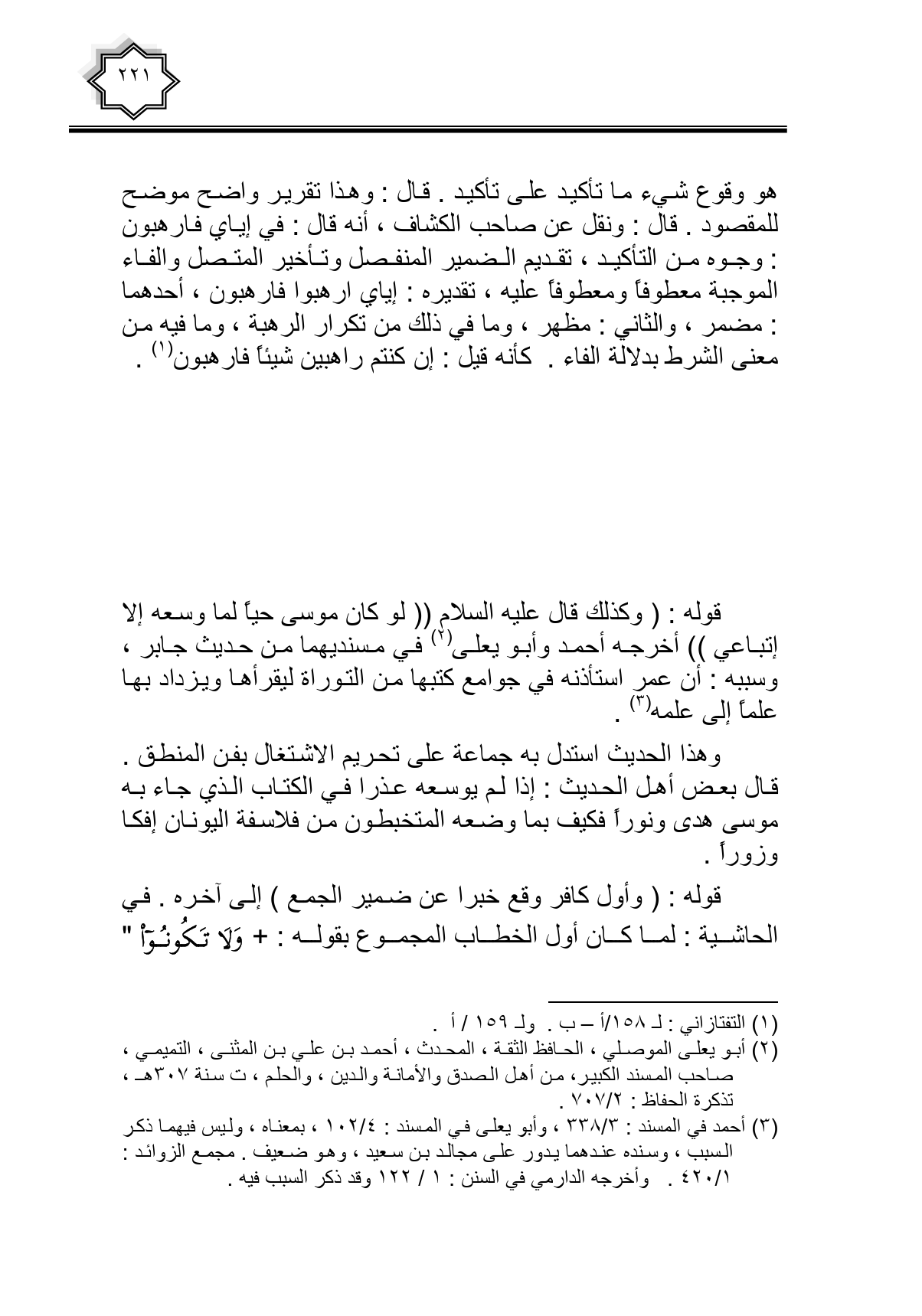 وهذا الحديث استدل به جماعة على تحريم الاشتغال بفن المنطق. قال بعض أهل الحديث: إذا لم يوسعه عذرا في الكتاب الذي جاء به موسى هدى ونوراً فكيف بما وضعه المتخبطون من فلاسفة اليونان إفكا وزورا.