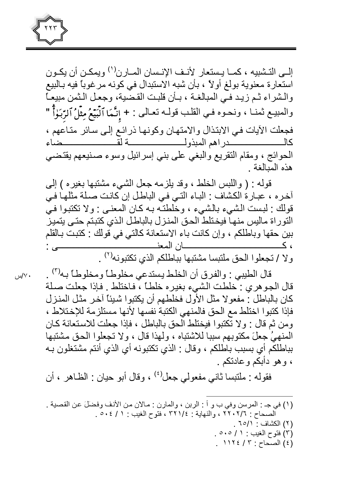 إلى التشبيه، كما يستعار لأنف الإنسان المارن ويمكن أن يكون استعارة معنوية بولغ أولاً، بأن شبه الاستبدال في كونه مرغوبا فيه بالبيع والشراء ثم زيد في المبالغة، بأن قلبت القضية، وجعل الثمن مبيعا والمبيع ثمنا، ونحوه في القلب قوله تعالى: {إِنَّمَا الْبَيْعُ مِثْلُ الرِّبَا} فجعلت الآيات في الابتذال والامتهان وكونها ذرائع إلى سائر متاعهم، كالدراهم المبذولة لقضاء الحوائج، ومقام التقريع والبغي على بني إسرائيل وسوء صنيعهم يقتضي هذه المبالغة.