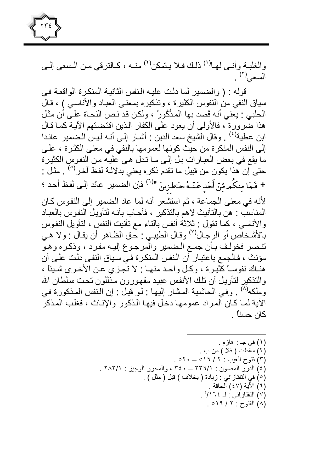 قوله: (والضمير لما دلت عليه النفس الثانية المنكرة الواقعة في سياق النفي من النفوس الكثيرة، وتذكيره بمعنى العباد والأناسي)، قال الحلبي: يعني أنه قصد بها المذكور، ولكن قد نص النحاة على أن مثل هذا ضرورة، فالأولى أن يعود على الكفار الذين اقتضتهم الآية كما قال ابن عطية. وقال الشيخ سعد الدين: أشار إلى أنه ليس الضمير عائدا إلى النفس المنكرة من حيث كونها لعمومها بالنفي في معنى الكثرة، على ما يقع في بعض العبارات بل إلى ما تدل هي عليه من النفوس الكثيرة حتى إن هذا يكون من قبيل ما تقدم ذكره يعني بدلالة لفظ آخر. مثل: {فَمَا مِنْكُمْ مِنْ أَحَدٍ عَنْهُ حَاجِزِينَ} فإن الضمير عائد إلى لفظ أحد؛ لأنه في معنى الجماعة، ثم استشعر أنه لما عاد الضمير إلى النفوس كان المناسب: هن بالتأنيث لاهم بالتذكير، فأجاب بأنه لتأويل النفوس بالعباد والأناس، كما تقول: ثلاثة أنفس بالتاء مع تأنيث النفس، لتأويل النفوس بالأشخاص أو الرجال وقال الطيبي: حق الظاهر أن يقال: ولا هي تنصر فخولف بأن جمع الضمير والمرجوع إليه مفرد، وذكره وهو مؤنث، فالجمع باعتبار أن النفس المنكرة في سياق النفي دلت على أن هناك نفوسا كثيرة، وكل واحد منها: لا تجزي عن الأخرى شيئا، والتذكير لتأويل أن تلك الأنفس عبيد مقهورون مذللون تحت سلطان الله وملكه. وفي الحاشية المشار إليها: لو قيل: إن النفس المذكورة في الآية لما كان المراد عمومها دخل فيها الذكور والإناث، فغلب المذكر كان حسنا.