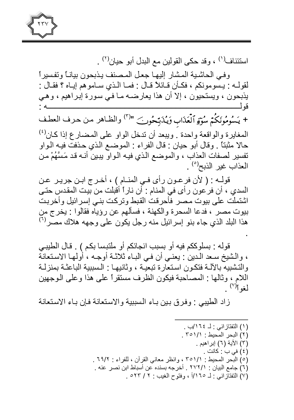 وفي الحاشية المشار إليها جعل المصنف يذبحون بيانا وتفسيرا لقوله: يسومونكم، فكأن قائلا قال: فما الذي ساموهم إياه؟ فقال: يذبحون، ويستحيون، إلا أن هذا يعارضه ما في سورة إبراهيم، وهي قوله: {يَسُومُونَكُمْ سُوءَ الْعَذَابِ وَيُذَبِّحُونَ} والظاهر من حرف العطف المغايرة والواقعة واحدة. ويبعد أن تدخل الواو على المضارع إذا كان حالا مثبتا. وقال أبو حيان: قال الفراء: الموضع الذي حذفت فيه الواو تفسير لصفات العذاب، والموضع الذي فيه الواو يبين أنه قد مسهم من العذاب غير الذبح.