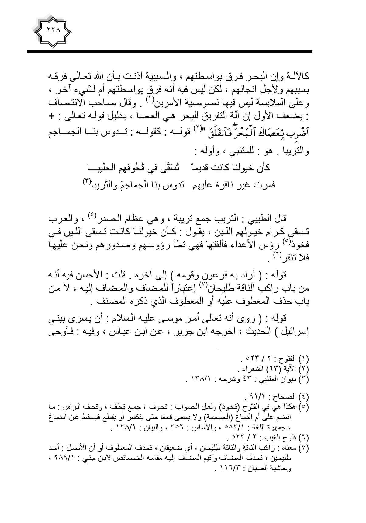 كالآلة وإن البحر فرق بواسطتهم، والسببية أذنت بأن الله تعالى فرقه بسببهم ولأجل انجائهم، لكن ليس فيه أنه فرق بواسطتهم أم لشيء آخر، وعلى الملابسة ليس فيها نصوصية الأمرين. وقال صاحب الانتصاف: يضعف الأول إن آلة التفريق للبحر هي العصا، بدليل قوله تعالى: {اضْرِبْ بِعَصَاكَ الْبَحْرَ فَانْفَلَقَ} قوله: كقوله: تدوس بنا الجماجم والتريبا. هو: للمتنبي، وأوله: