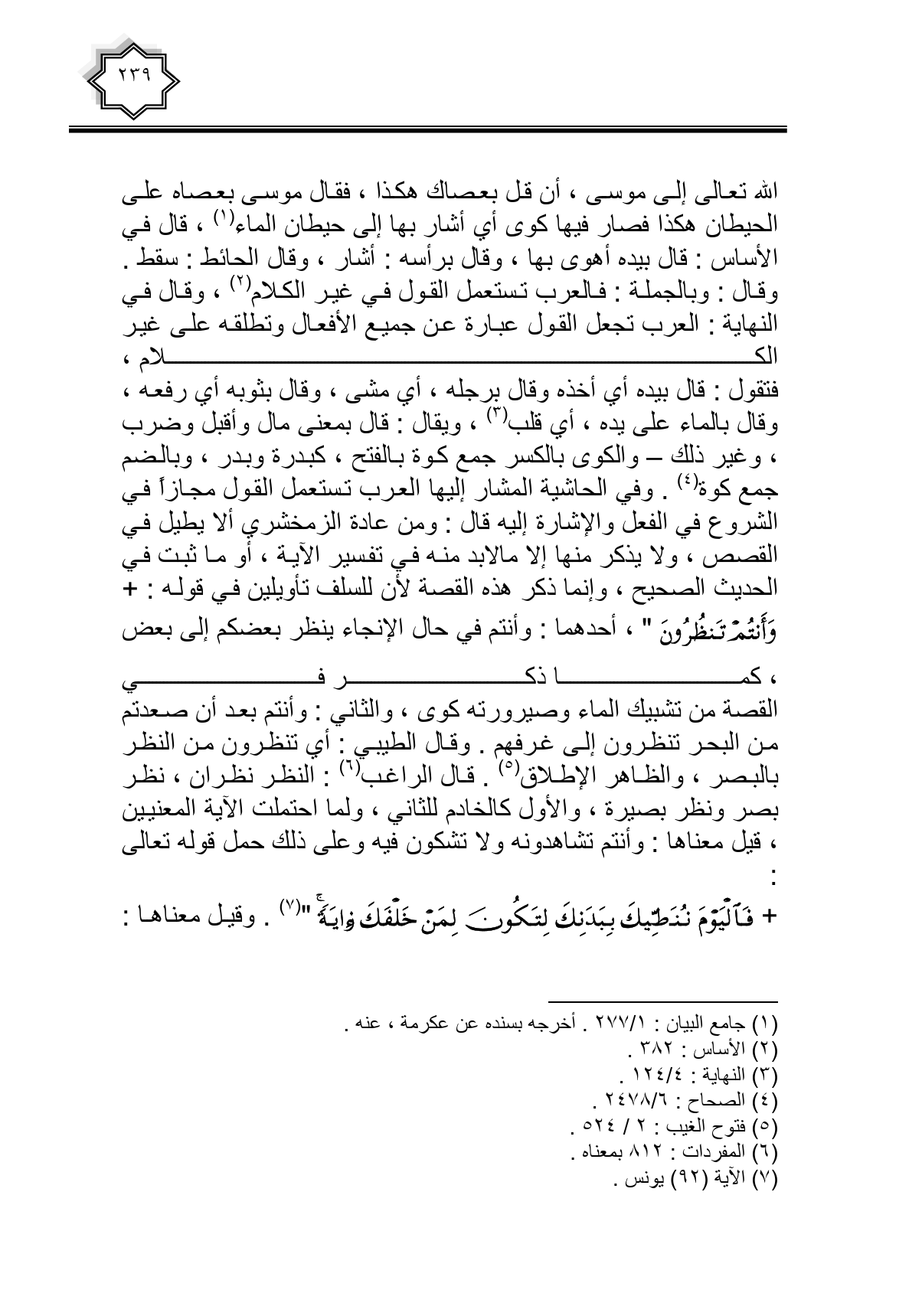 الله تعالى إلى موسى، أن قل بعصاك هكذا، فقال موسى بعصاه على الحيطان هكذا فصار فيها كوى أي أشار بها إلى حيطان الماء، قال في الأساس: قال بيده أهوى بها، وقال برأسه: أشار، وقال الحائط: سقط. وقال: وبالجملة: فالعرب تستعمل القول في غير الكلام، وقال في النهاية: العرب تجعل القول عبارة عن جميع الأفعال وتطلقه على غير الكلام فتقول: قال بيده أي أخذه وقال برجله، أي مشى، وقال بثوبه أي رفعه، وقال بالماء على يده، أي قلب، ويقال: قال بمعنى مال وأقبل وضرب، وغير ذلك- والكوى بالكسر جمع كوة بالفتح، كبدرة وبدر، وبالضم جمع كوة. وفي الحاشية المشار إليها العرب تستعمل القول مجازاً في الشروع في الفعل والإشارة إليه قال: ومن عادة الزمخشري ألا يطيل في القصص، ولا يذكر منها إلا ما لابد منه في تفسير الآية، أو ما ثبت في الحديث الصحيح، وإنما ذكر هذه القصة لأن للسلف تأويلين في قوله: {وَأَنْتُمْ تَنْظُرُونَ}، أحدهما: وأنتم في حال الانجاء ينظر بعضكم إلى بعض، كما ذكر فى القصة من تشبيك الماء وصيرورته كوى، والثاني: وأنتم بعد أن صعدتم من البحر تنظرون إلى غرفهم. وقال الطيبي: أي ينظرون من النظر بالبصر، والظاهر الإطلاق. قال الراغب: النظر نظران، نظر بصر ونظر بصيرة، والأول كالخادم للثاني، ولما احتملت الآية المعنيين، قيل معناها: وأنتم تشاهدونه ولا تشكون فيه وعلى ذلك حمل قوله تعالى: {فَالْيَوْمَ نُنَجِّيكَ بِبَدَنِكَ لِتَكُونَ لِمَنْ خَلْفَكَ آيَةً}. وقيل معناها: