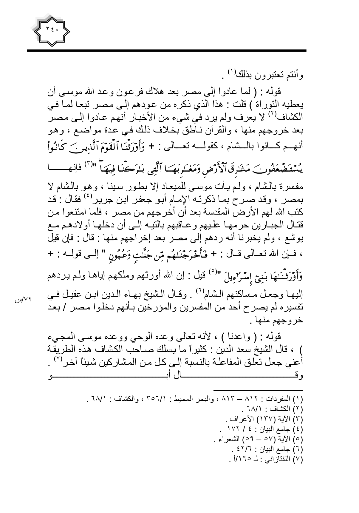 قوله: (لما عادوا إلى مصر بعد هلاك فرعون وعد الله موسى أن يعطيه التوراة) قلت: هذا الذي ذكره من عودهم إلى مصر تبعا لما في الكشاف لا يعرف ولم يرد في شيء من الأخبار أنهم عادوا إلى مصر بعد خروجهم منها، والقرآن ناطق بخلاف ذلك في عدة مواضع، وهو أنهم كانوا بالشام، كقوله تعالى: {وَأَوْرَثْنَا الْقَوْمَ الَّذِينَ كَانُوا يُسْتَضْعَفُونَ مَشَارِقَ الْأَرْضِ وَمَغَارِبَهَا الَّتِي بَارَكْنَا فِيهَا} فإنها مفسرة بالشام، ولم يأت موسى للميعاد إلا بطور سينا، وهو بالشيء لا بمصر، وقد صرح بما ذكرته الإماء أبو جعفر ابن جرير فقال: قد كتب الله لهم الأرض المقدسة بعد أن أخرجهم من مصر، فلما امتنعوا من قتال الجبارين حرمها عليهم وعاقبهم بالتيه إلى أن دخلها أولادهم مع يوشع، ولم يخبرنا أنه ردهم إلى مصر بعد إخراجهم منها: قال: فإن قيل، فإن الله تعالى قال: {فَأَخْرَجْنَاهُمْ مِنْ جَنَّاتٍ وَعُيُونٍ} إلى قوله: {وَأَوْرَثْنَاهَا بَنِي إِسْرَائِيلَ} قيل: إن الله أورثهم وملكهم إياها ولم يردهم إليها وجعل مساكنهم الشام. وقال الشيخ بهاء الدين ابن عقيل في تفسيره لم يصرح أحد من المفسرين والمؤرخين بأنهم دخلوا مصر/ بعد خروجهم منها.