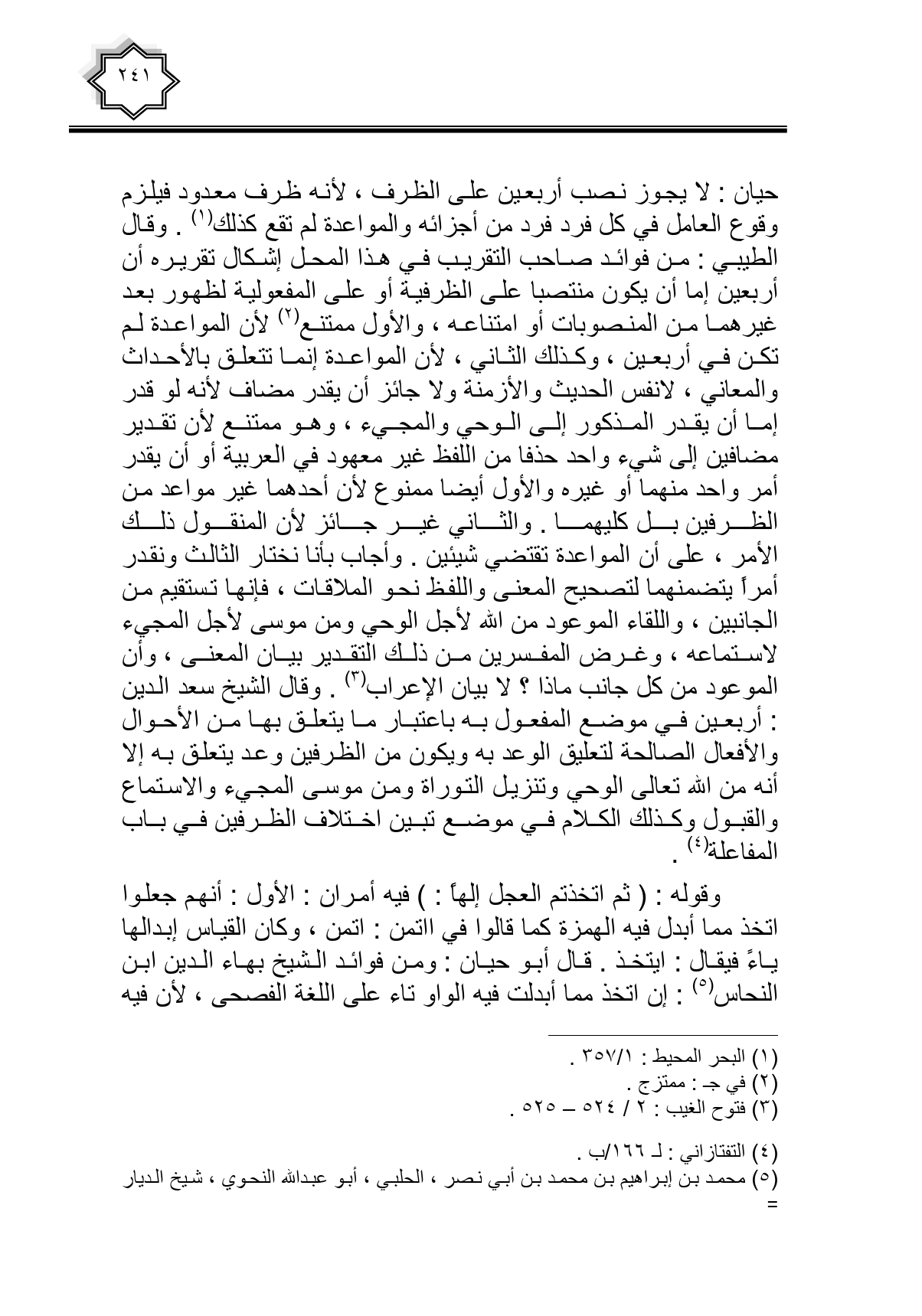 حيان: لا يجوز نصب أربعين على الظرف، لأنه ظرف معدود فيلزم وقوع العامل في كل فرد فرد من أجزائه والمواعدة لم تقع كذلك. وقال الطيبي: من فوائد صاحب التقريب في هذا المحل إشكال تقريره أن أربعين إما أن يكون منتصبا على الظرفية أو على المفعولية لظهور بعد غيرهما من المنصوبات أو امتناعه، والأول ممتنع لأن المواعدة لم تكن في أربعين، وكذلك الثاني، لأن المواعدة إنما تتعلق بالأحداث والمعاني، لانفس الحديث والأزمنة ولا جائز أن يقدر مضاف لأنه لو قدر إما أن يقدر المذكور إلى الوحي والمجيء، وهو ممتنع لأن تقدير مضافين إلى شيء واحد حذفا من اللفظ غير معهود في العربية أو أن يقدر أمر واحد منهما أو غيره والأول أيضا ممنوع لأن أحدهما غير مواعد من الظرفين بل كليهما. والثاني غير جائز لأن المنقول ذلك الأمر، على أن المواعدة تقتضي شيئين. وأجاب بأنا نختار الثالث ونقدر أمراً يتضمنهما لتصحيح المعنى واللفظ نحو الملاقات، فإنها تستقيم من الجانبين، واللقاء الموعود من الله لأجل الوحي ومن موسى لأجل المجيء لاستماعه، وغرض المفسرين من ذلك التقدير بيان المعنى، وأن الموعود من كل جانب ماذا؟ لا بيان الإعراب. وقال الشيخ سعد الدين: أربعين في موضع المفعول به باعتبار ما يتعلق بها من الأحوال والأفعال الصالحة لتعليق الوعد به ويكون من الظرفين وعد يتعلق به إلا أنه من الله تعالى الوحي وتنزيل التوراة ومن موسى المجيء والاستماع والقبول وكذلك الكلام في موضع تبين اختلاف الظرفين في باب المفاعلة.