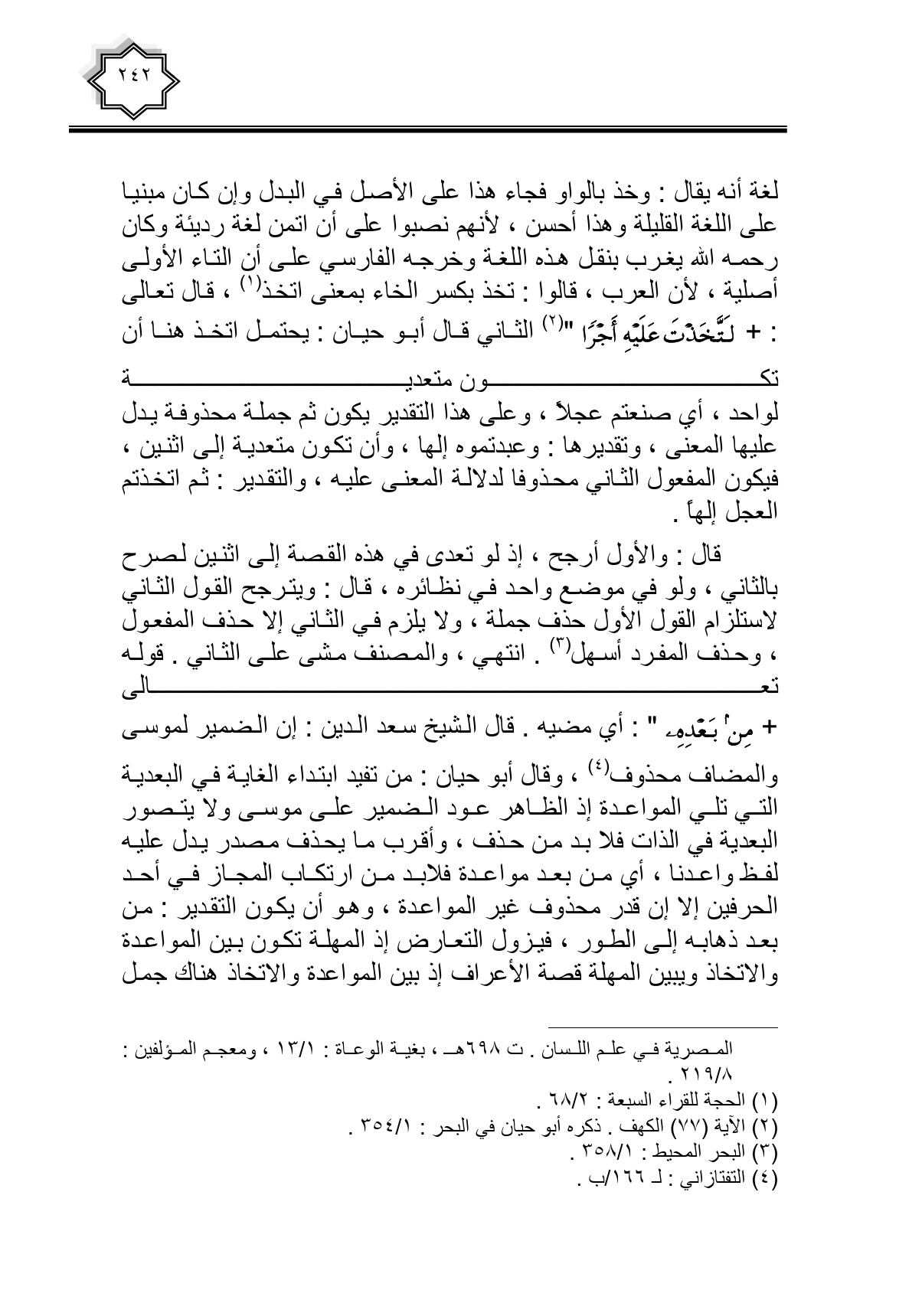 لغة أنه يقال: وخذ بالواو فجاء هذا على الأصل في البدل وإن كان مبنيا على اللغة القليلة وهذا أحسن، لأنهم نصبوا على أن أتمن لغة رديئة وكان رحمه الله يغرب بنقل هذه اللغة وخرجه الفارسي على أن التاء الأولى أصلية، لأن العرب، قالوا: تخذ بكسر الخاء بمعنى اتخذ، قال تعالى: {لَاتَّخَذْتَ عَلَيْهِ أَجْرًا} الثاني قال أبو حيان: يحتمل اتخذ هنا أن