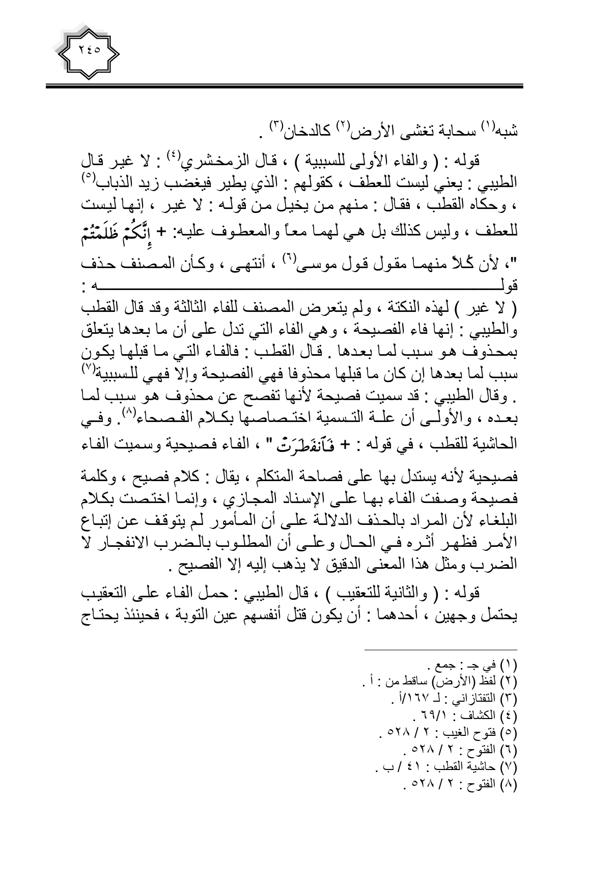 قوله: (والفاء الأولى للسببية)، قال الزمخشري: لا غير قال الطيبي: يعني ليست للعطف، كقولهم: الذي يطير فيغضب زيد الذباب، وحكاه القطب، فقال: منهم من يخيل من قوله: لا غير، إنها ليست للعطف، وليس كذلك بل هي لهما معا والمعطوف عليه: {إِنَّكُمْ ظَلَمْتُمْ}، لأن كلا منهما مقول قول موسى، انتهى، وكان المصنف حذف قوله: (لا غير) لهذه النكتة: ولم يتعرض المصنف للفاء الثالثة وقد قال القطب والطيبي: إنها فاء الفصيحة، وهي الفاء التي تدل على أن ما بعدها يتعلق بمحذوف هو سبب لما بعدها. قال القطب: فالفاء التي ما قبلها يكون سبب لما بعدها إن كان ما قبلها محذوفا فهي الفصيحة وإلا فهي للسببية. وقال الطيبي: قد سميت فصيحة لأنها تفصح عن محذوف هو سبب لما بعده، والأولى أن علة التسمية اختصاصها بكلام الفصحاء. وفي الحاشية للقطب، في قوله: {انْفَطَرَتْ}: الفاء فصيحية وسميت الفاء فصيحية لأنه يستدل بها على فصاحة المتكلم، يقال: كلام فصيح، وكلمة فصيحة وصفت الفاء بها على الإسناد المجازي، وإنما اختصت بكلام البلغاء لأن المراد بالحذف الدلالة على أن المأمور لم يتوقف عن إتباع الأمر فظهر أثره في الحال وعلى أن المطلوب بالضرب الانفجار لا الضرب ومثل هذا المعنى الدقيق لا يذهب إليه إلا الفصيح.