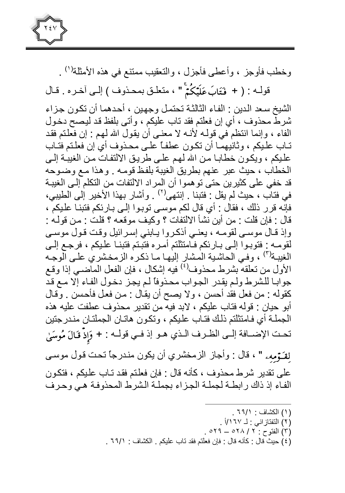 قوله: ({فَتَابَ عَلَيْكُمْ}، متعلق بمحذوف) إلى آخره. قال الشيخ سعد الدين: الفاء الثالثة تحتمل وجهين، أحدهما أن تكون جزاء شرط محذوف، أي إن فعلتم فقد تاب عليكم، وأتى بلفظ قد ليصح دخول الفاء، وإنما انتظم في قوله لأنه لا معنى أن يقول الله لهم: إن فعلتم فقد تاب عليكم، وثانيهما أن تكون عطفا على محذوف أي إن فعلتم فتاب عليكم، ويكون خطابا من الله لهم على طريق الالتفات من الغيبة إلى الخطاب، حيث عبر عنهم بطريق الغيبة بلفظ قومه. وهذا مع وضوحه قد خفي على كثيرين حتى توهموا أن المراد الالتفات من التكلم إلى الغيبة في فتاب، حيث لم يقل: فتبنا. انتهى. وأشار بهذا الأخير إلى الطيبي، فإنه قرر ذلك، فقال: أي قال لكم موسى توبوا إلى بارئكم فتبنا عليكم، قال: فإن قلت: من أين نشأ الالتفات؟ وكيف موقعه؟ قلت: من قوله: وإذ قال موسى لقومه، يعني أذكروا يابني إسرائيل وقت قول موسى لقومه: فتوبوا إلى بارئكم فامتثلتم أمره فتبتم فتبنا عليكم، فرجع إلى الغيبة، وفي الحاشية المشار إليها ما ذكره الزمخشري على الوجه الأول من تعلقه بشرط محذوف فيه إشكال، فإن الفعل الماضي إذا وقع جوابا للشرط ولم يقدر الجواب محذوفا لم يجز دخول الفاء إلا مع قد كقوله: من فعل فقد أحسن، ولا يصح أن يقال: من فعل فأحسن. وقال أبو حيان: قوله فتاب عليكم، لابد فيه من تقدير محذوف عطفت عليه هذه الجملة أي فامتثلتم ذلك فتاب عليكم، وتكون هاتان الجملتان مندرجتين تحت الإضافة إلى الظرف الذي هو إذ في قوله: {وَإِذْ قَالَ مُوسَى لِقَوْمِهِ}، قال: وأجاز الزمخشري أن يكون مندرجا تحت قول موسى على تقدير شرط محذوف، كأنه قال: فإن فعلتم فقد تاب عليكم، فتكون الفاء إذ ذاك رابطة لجملة الجزاء بجملة الشرط المحذوفة هي وحرف