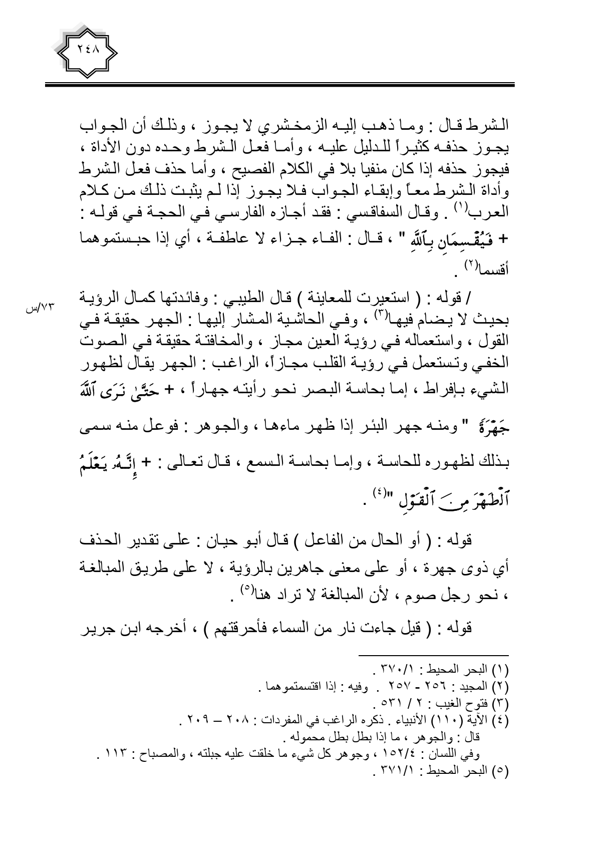 الشرط قال: وما ذهب إليه الزمخشري لا يجوز، وذلك أن الجواب يجوز حذفه كثيراً للدليل عليه، وأما فعل الشرط وحده دون الأداة، فيجوز حذفه إذا كان منفيا بلا في الكلام الفصيح، وأما حذف فعل الشرط وأداة الشرط معا وإبقاء الجواب فلا يجوز إذا لم يثبت ذلك من كلام العرب. وقال السفاقسي: فقد أجازه الفارسي في الحجة في قوله: {فَيُقْسِمَانِ بِاللَّهِ}، قال: الفاء جزاء لا عاطفة، أي إذا حبستموهما أقسما.