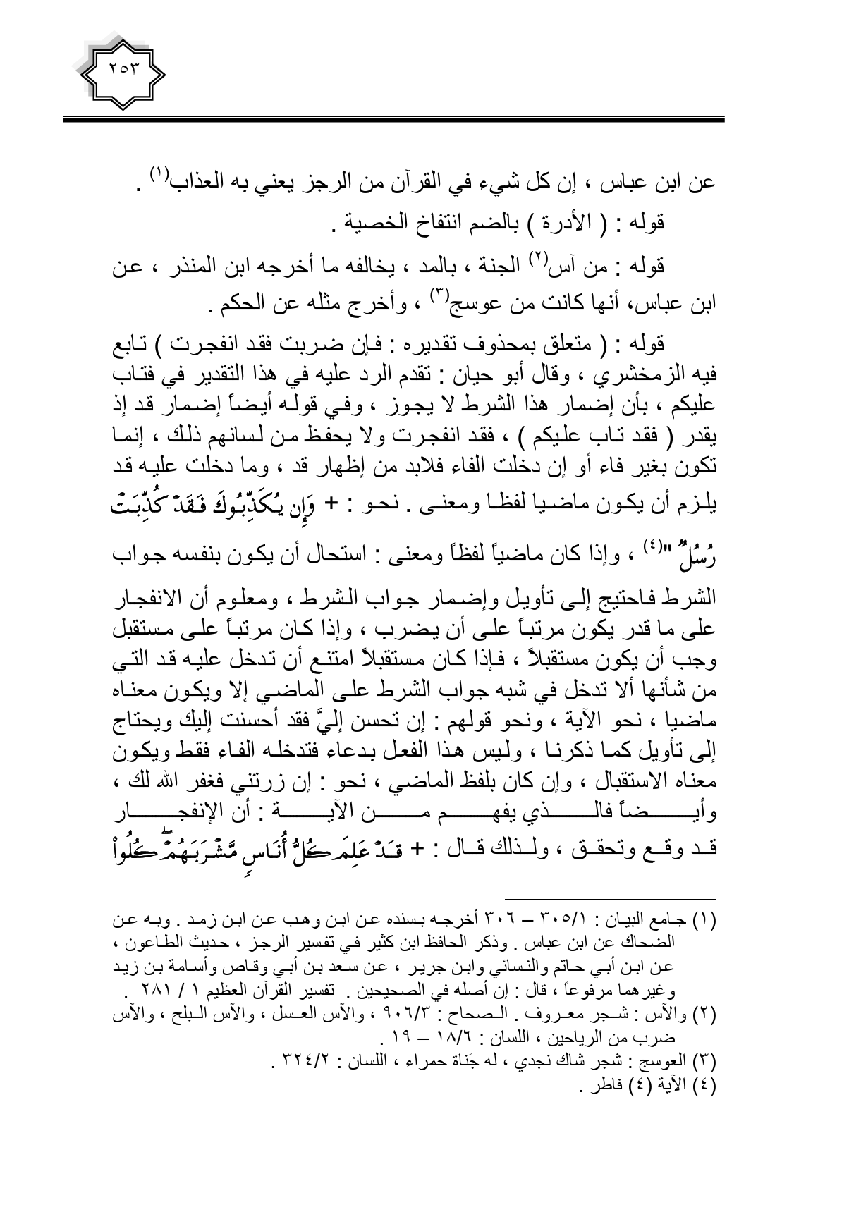 قوله: (متعلق بمحذوف تقديره: فإن ضربت فقد انفجرت) تابع فيه الزمخشري، وقال أبو حيان: تقدم الرد عليه في هذا التقدير في فتاب عليكم، بأن إضمار هذا الشرط لا يجوز، وفي قوله أيضا إضمار قد إذ يقدر (فقد تاب عليكم)، فقد انفجرت ولا يحفظ من لسانهم ذلك، إنما تكوك بغير فاء أو إن دخلت الفاء فلابد من إظهار قد، وما دخلت عليه قد يلزم أن يكون ماضيا لفظا ومعنى. نحو: {وَإِنْ يُكَذِّبُوكَ فَقَدْ كُذِّبَتْ رُسُلٌ}، وإذا كان ماضيا لفظا ومعنى: استحال أن يكون بنفسه جواب الشرط فاحتيج إلى تأويل وإضمار جواب الشرط، ومعلوم أن الانفجار على ما قدر يكون مرتبا على أن يضرب، وإذا كان مرتبا على مستقبل وجب أن يكون مستقبلا، فإذا كان مستقبلا امتنع أن تدخل عليه قد التي من شأنها ألا تدخل في شبه جواب الشرط على الماضي إلا ويكون معناه ماضيا، نحو الآية، ونحو قولهم: إن تحسن إلي فقد أحسنت إليك ويحتاج إلى تأويل كما ذكرنا، وليس هذا الفعل بدعاء فتدخله الفاء فقط ويكون معناه الاستقبال، وإن كان بلفظ الماضي، نحو: إن زرتني فغفر الله لك، وأيضا فالذي يفهم من الآية: أن الإنفجار قد وقع وتحقق، ولذلك قال: {قَدْ عَلِمَ كُلُّ أُنَاسٍ مَشْرَبَهُمْ كُلُوا