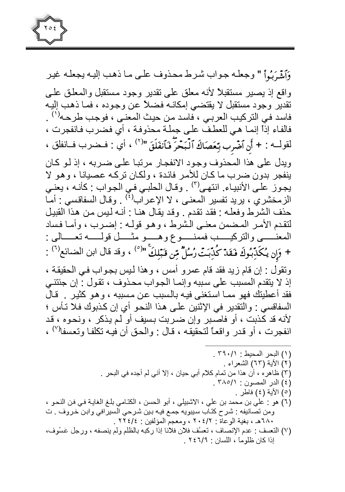 وَاشْرَبُوا} وجعله جواب شرط محذوف على ما ذهب إليه يجعله غير واقع إذ يصير مستقبلا لأنه معلق على تقدير وجود مستقبل والمعلق على تقدير وجود مستقبل لا يقتضي إمكانه فضلا عن وجوده، فما ذهب إليه فاسد في التركيب العربي، فاسد من حيث المعنى، فوجب طرحه. فالفاء إذا إنما هي للعطف على جملة محذوفة، أي فضرب فانفجرت، لقوله: {أَنِ اضْرِبْ بِعَصَاكَ الْبَحْرَ فَانْفَلَقَ}، أي: فضرب فانفلق، ويدل على هذا المحذوف وجوب الانفجار مرتبا على ضربه، إذ لو كان ينفجر بدون ضرب ما كان للأمر فائدة، ولكان تركه عصيانا، وهو لا يجوز على الأنبياء. انتهى. وقال الحلبي في الجواب: كأنه، يعني الزمخشري، يريد تفسير المعنى، لا الإعراب. وقال السفاقسي: أما حذف الشرط وفعله: فقد تقدم. وقد يقال هنا: أنه ليس من هذا القبيل لتقدم الأمر المضمن معنى الشرط، وهو قوله: إضرب، وأما فساد المعنى والتركيب فممنوع وهو مثل قوله تعالى: {وَإِنْ يُكَذِّبُوكَ فَقَدْ كُذِّبَتْ رُسُلٌ مِنْ قَبْلِكَ}، وقد قال ابن الضائع: وتقول: إن قام زيد فقد قام عمرو أمس، وهذا ليس بجواب في الحقيقة، إذ لا يتقدم المسبب على سببه وإنما الجواب محذوف، تقول: إن جنتنى فقد أعطيتك فهو مما استغنى فيه بالسبب عن مسببه، وهو كثير. قال السفاقسي: والتقدير في الإثنين على هذا النحو أي إن كذبوك فلا تأس؛ لأنه قد كذبت، أو فاصبر وإن ضربت بسيف أو لم يذكر، ونحوه، قد انفجرت، أو قدر واقعا لتحقيقه، قال: والحق أن فيه تكلفا وتعسفا،