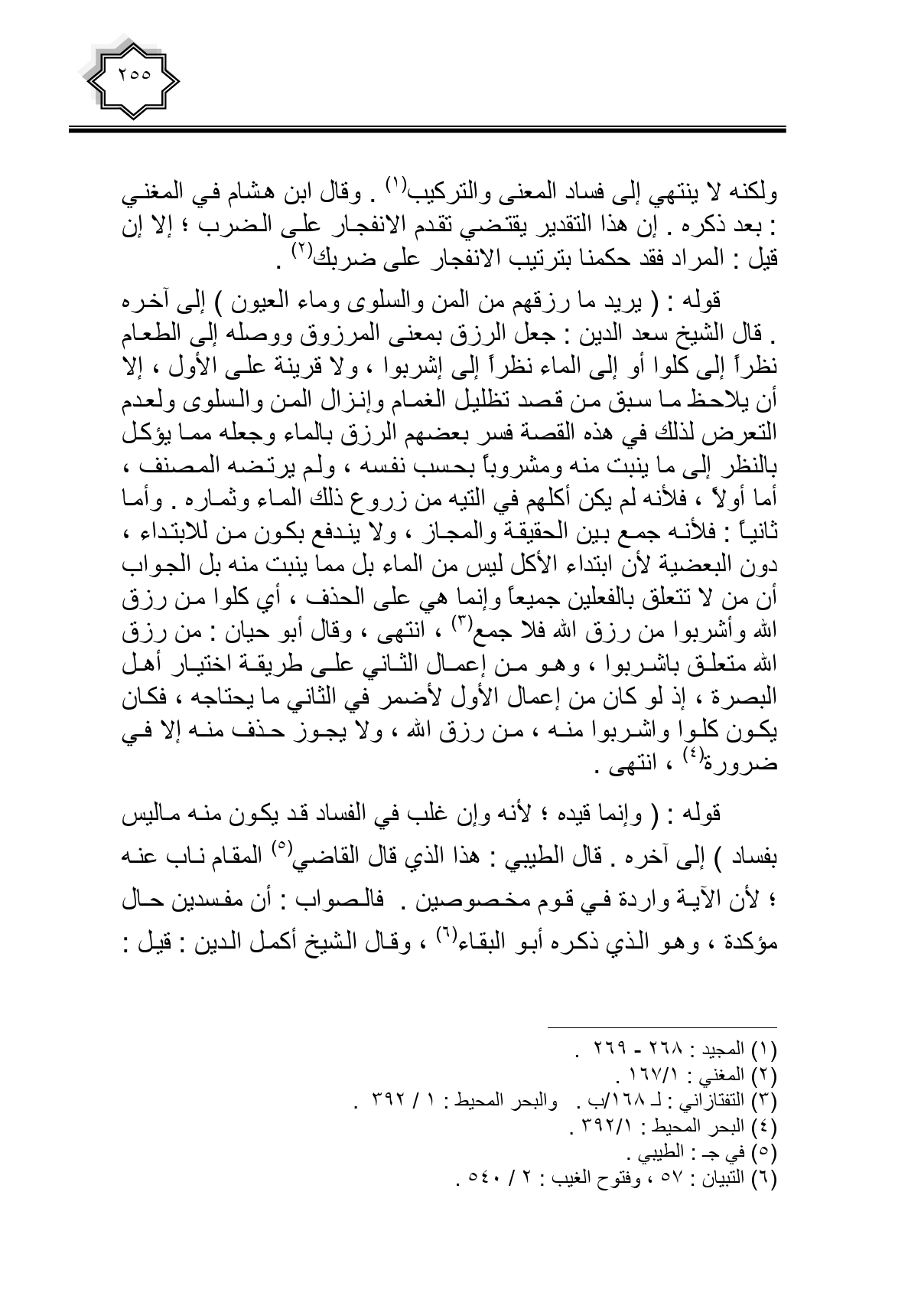 قوله: (يريد ما رزقهم من المن والسلوى وماء العيون) إلى آخره. قال الشيخ سعد الدين: جعل الرزق بمعنى المرزوق ووصله إلى الطعام نظراً إلى كلوا أو إلى الماء نظراً إلى إشربوا، ولا قرينة على الأول، إلا أن يلاحظ ما سبق من قصد تظليل الغمام وإنزال المن والسلوى ولعدم التعرض لذلك في هذه القصة فسر بعضهم الرزق بالماء وجعله مما يؤكل بالنظر إلى ما ينبت منه ومشروبا بحسب نفسه، ولم يرتضه المصنف، أما أولاً، فلأنه لم يكن أكلهم في التيه من زروع ذلك الماء وثماره. وأما ثانيا: فلأنه جمع بين الحقيقة والمجاز، ولا يندفع بكون من للابتداء، دون البعضية لأن ابتداء الأكل ليس من الماء بل مما ينبت منه بل الجواب أن من لا تتعلق بالفعلين جميعا وإنما هي على الحذف، أي كلوا من رزق الله وأشربوا من رزق الله فلا جمع، انتهى، وقال أبو حيان: من رزق الله متعلق باشربوا، وهو من إعمال الثاني على طريقة اختيار أهل البصرة، إذ لو كان من إعمال الأول لأضمر في الثاني ما يحتاجه، فكان يكون كلوا واشربوا منه، من رزق الله، ولا يجوز حذف منه إلا في ضرورة، انتهي.