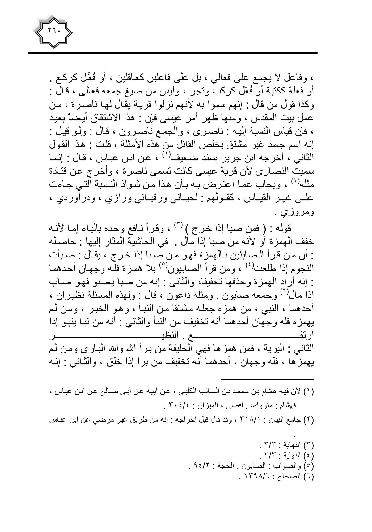 قوله: (فمن صبا إذا خرج)، وقرأ نافع وحده بالباء إما لأنه خفف الهمزة أو لأنه من صبا إذا مال. في الحاشية المشار إليها: حاصله: أن من قرأ الصابئين بالهمزة فهو من صبا إذا خرج، يقال: صبأت النجوم إذا طلعت، ومن قرأ الصابيون بلا همزة فله وجهان أحدهما: إنه أراد الهمزة وحذفها تحفيفا، والثاني: إنه من صبا يصبو فهو صاب إذا مال وجمعه صابون. ومثله داعون، قال: ولهذه المسئلة نظيران، أحدهما، النبي، من همزه جعله مشتقا من النبأ، وهو الخبر، ومن لم يهمزه فله وجهان أحدهما أنه تخفيف من النبأ والثاني: أنه من نبا ينبو إذا أرتفع. النظير الثاني: البرية، فمن همزها فهي الخليقة من برأ الله والله الباري ومن لم يهمزها، فله وجهان، أحدهما أنه تخفيف من برا إذا خلق، والثاني: إنه