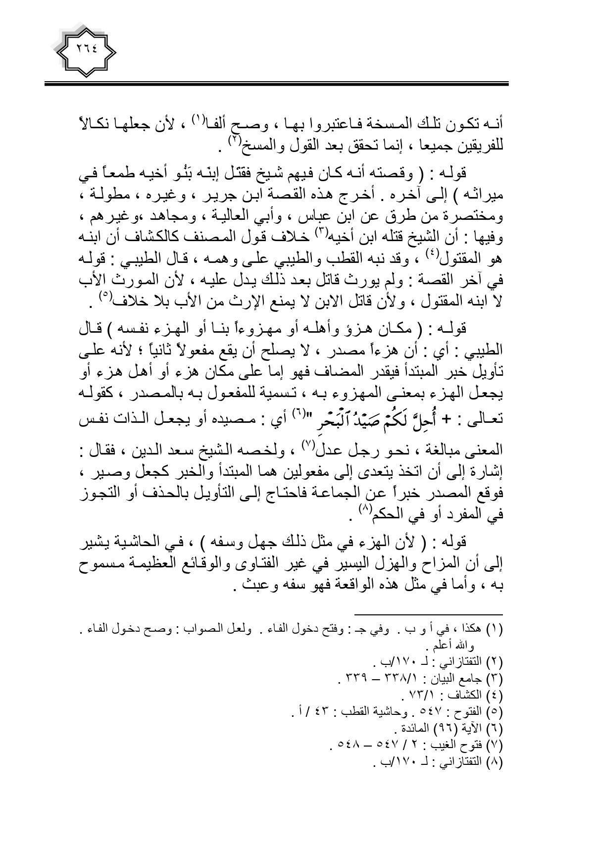 قوله: (لأن الهزء في مثل ذلك جهل وسفه)، في الحاشية يشير إلى أن المزاح والهزل اليسير في غير الفتاوى والوقائع العظيمة مسموح به، وأما في مثل هذه الواقعة فهو سفه وعبث.