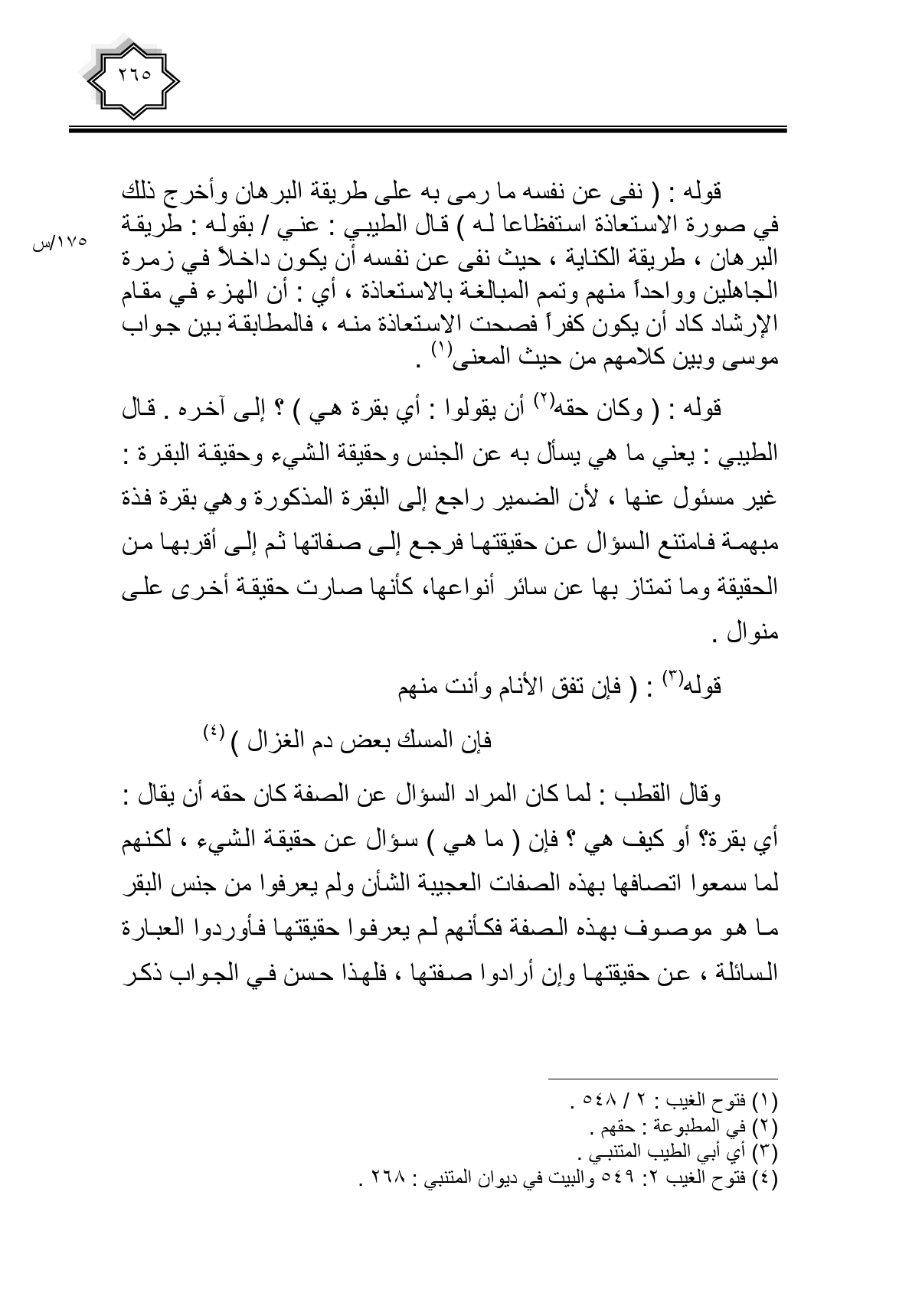 قوله: (نفى عن نفسه ما رمى به على طريقة البرهان وأخرج ذلك في صورة الاستعاذة استفظاعا له) قال الطيبي: عني/ بقوله: طريقة البرهان، طريقة الكناية، حيث نفى عن نفسه أن يكون داخلا في زمرة الجاهلين وواحداً منهم وتمم المبالغة بالاستعادة، أي: أن الهزء في مقام الإرشاد كاد أن يكون كفراً فصحت الاستعاذة منه، فالمطابقة بين جواب موسى وبين كلامهم من حيث المعنى.