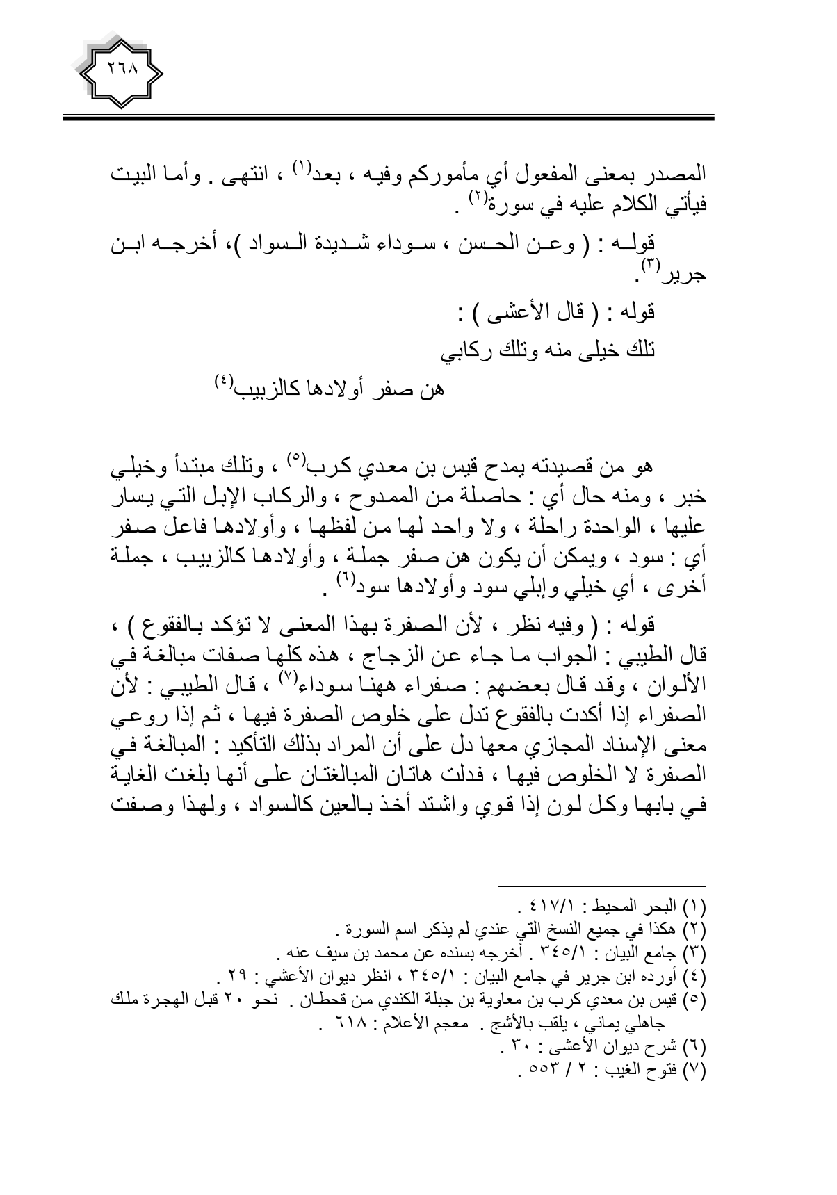 قوله: (وفيه نظر، لأن الصفرة بهذا المعنى لا تؤكد بالفقوع)، قال الطيبي: الجواب ما جاء عن الزجاج، هذه كلها صفات مبالغة في الألوان، وقد قال بعضهم: صفراء ههنا سوداء، قال الطيبي: لأن الصفراء إذا أكدت بالفقوع تدل على خلوص الصفرة فيها، ثم إذا روعي معنى الإسناد المجازي معها دل على أن المراد بذلك التأكيد: المبالغة في الصفرة لا الخلوص فيها، فدلت هاتان المبالغتان على أنها بلغت الغاية في بابها وكل لون إذا قوي واشتد أخذ بالعين كالسواد، ولهذا وصفت