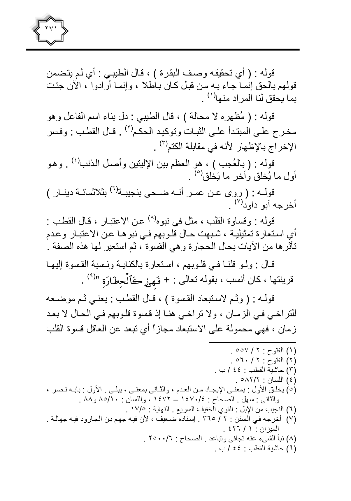 قوله: (وثم لاستبعاد القسوة): قال القطب: يعني ثم موضعه للتراخي في الزمان، ولا تراخي هنا إذ قسوة قلوبهم في الحال لا بعد زمان، فهي محمولة على الاستبعاد مجازاً أي تبعد عن العاقل قسوة القلب