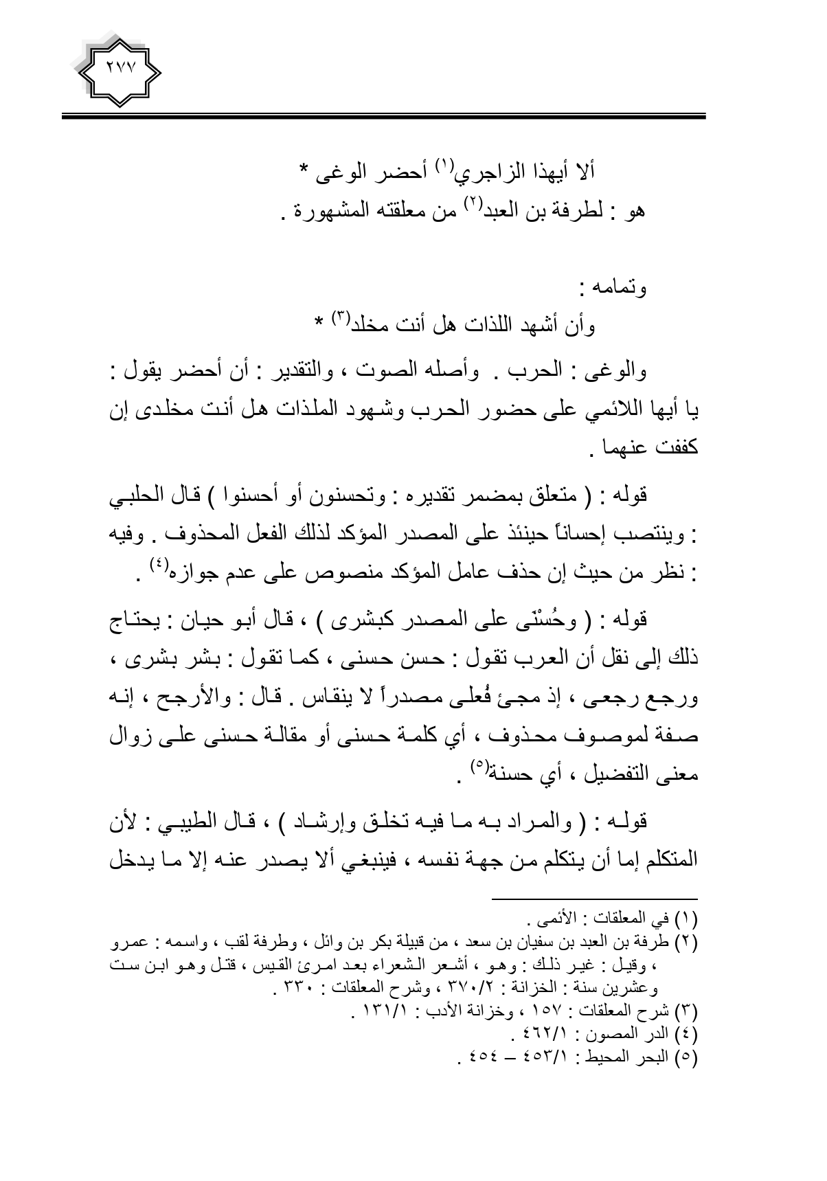 والوغى: الحرب. وأصله الصوت: والتقدير: أن أحضر يقول: يا أيها اللائمي على حضور الحرب وشهود الملذات هل أنت مخلدي أن كففت عنهما.