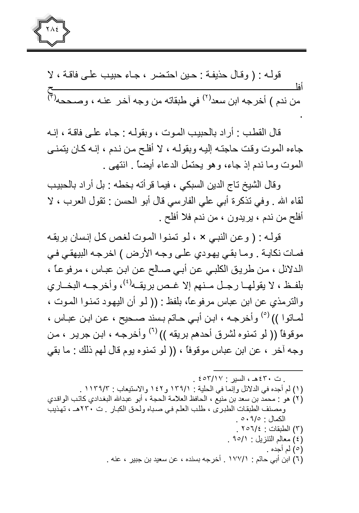 قوله: (وقال حذيفة: حين احتضر، جاء حبيب على فاقة، لا أفلح من ندم) أخرجه ابن سعد في طبقاته من وجه آخر عنه، وصححه.