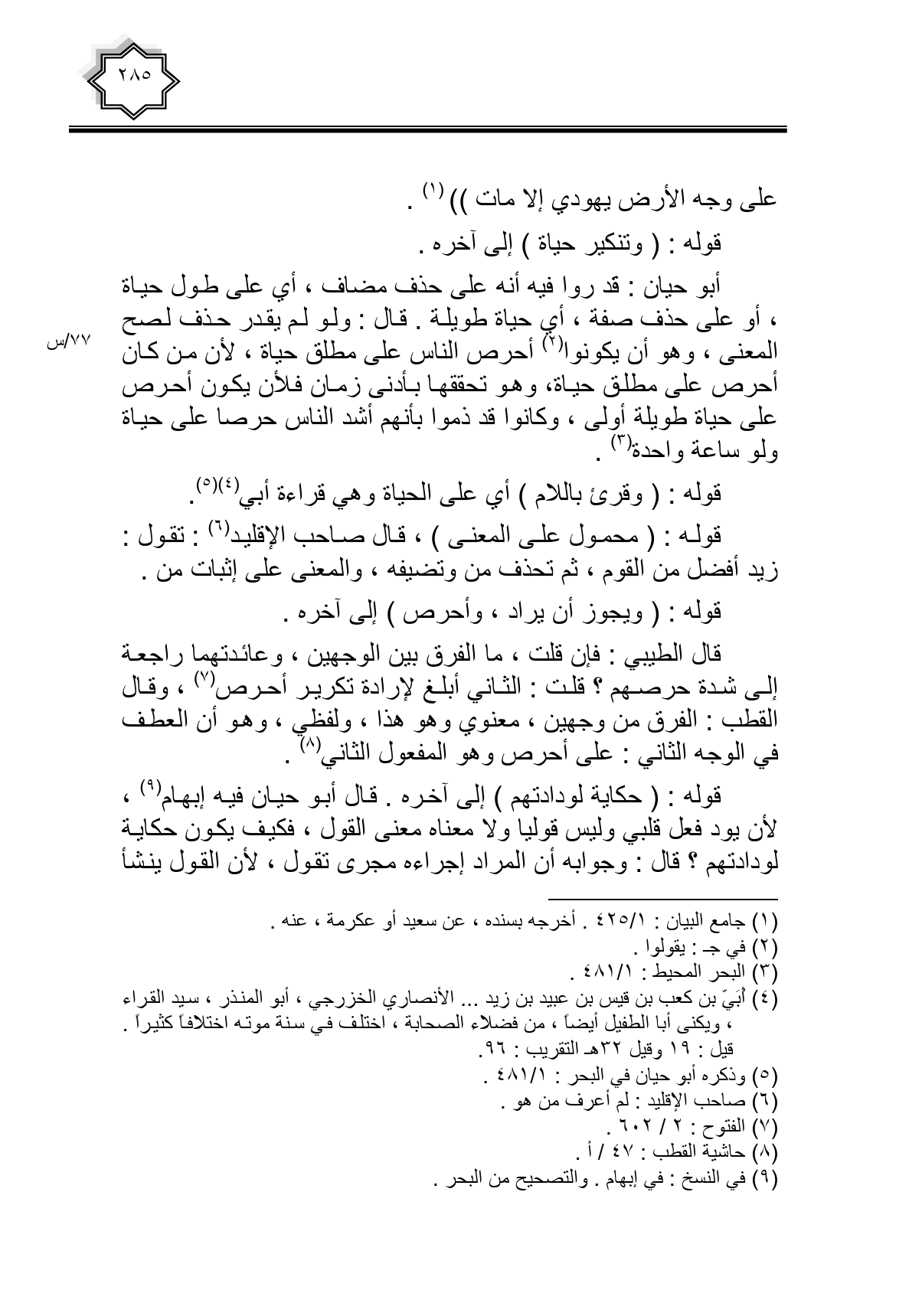 أبو حيان: قد روا فيه أنه على حذف مضاف، أي على طول حياة، أو على حذف صفة، أي حياة طويلة. قال: ولو لم يقدر حذف لصح المعنى، وهو أن يكونوا أحرص الناس على مطلق حياة، لأن من كان أحرص على مطلق حياة، وهو تحققها بأدنى زمان فلأن يكون أحرص على حياة طويلة أولى، وكانوا قد ذموا بأنهم أشد الناس حرصا على حياة ولو ساعة وأحدة.