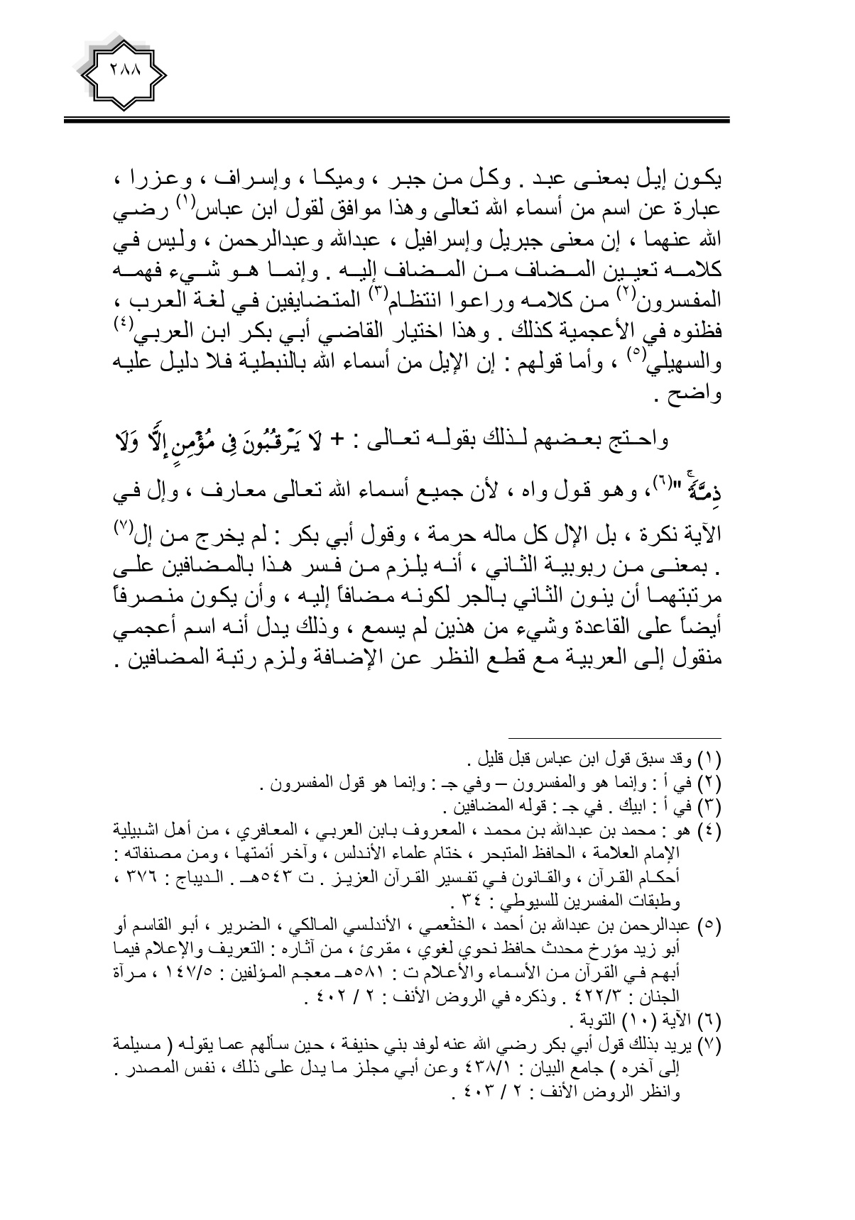 واحتج بعضهم لذلك بقوله تعالى: {لَا يَرْقُبُونَ فِي مُؤْمِنٍ إِلًّا وَلَا ذِمَّةً}، وهو قول واه، لأن جميع أسماء الله تعالى معارف، وإل في الآية نكرة: بل الإل كل ماله حرمة، وقول أبى بكر: لم يخرج من إل. بمعنى من ربوبية الثاني، أنه يلزم من فسر هذا بالمضافين على مرتبتهما أن ينون الثاني بالجر لكونه مضافا إليه، وأن يكون منصرفا أيضا على القاعدة وشيء من هذين لم يسمع، وذلك يدل أنه اسم أعجمي منقول إلى العربية مع قطع النظر عن الإضافة ولزم رتبة المضافين.