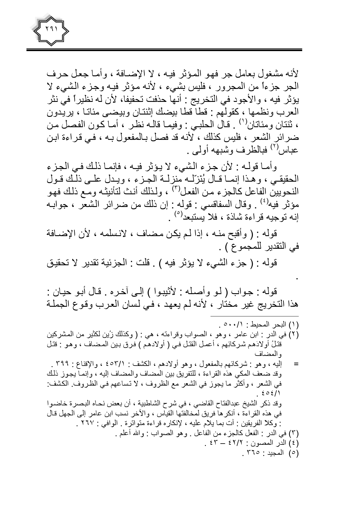 لأنه مشغول بعامل جر فهو المؤثر فيه، لا الإضافة، وأما جعل حرف الجر جزءا من المجرور، فليس بشيء، لأنه مؤثر فيه وجزء الشيء لا يؤثر فيه، والأجود في التخريج: أنها حذفت تحفيفا، لأن له نظيراً في نثر العرب ونظمها، كقولهم: قطا قطا بيضك إثنتان وبيضي مئاتا، يريدون، ثنتان ومئاتان. قال الحلبي: وفيما قاله نظر، أما كون الفصل من ضرائر الشعر، فليس كذلك، لأنه قد فصل بالمفعول به، في قراءة ابن عباس فبالظرف وشبهه أولى.