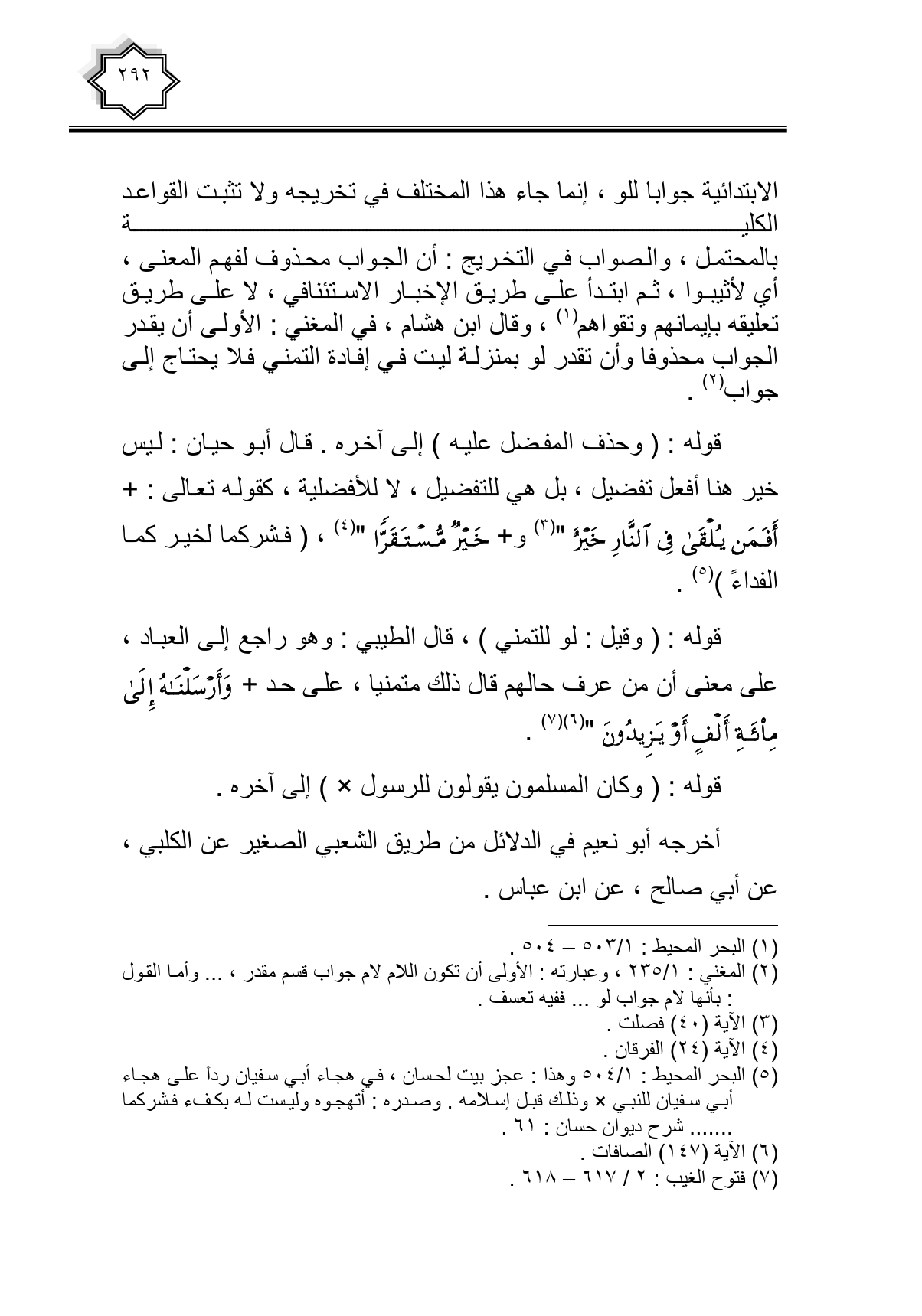 الابتدائية جوابا للو، إنما جاء هذا المختلف في تخريجه ولا تثبت القواعد الكلية بالمحتمل، والصواب في التخريج: أن الجواب محذوف لفهم المعنى، أي لأثيبوا، ثم ابتدأ على طريق الإخبار الاستئنافي، لا على طريق تعليقه بإيمانهم وتقواهم، وقال ابن هشام، في المغني: الأولى أن يقدر الجواب محذوفا وأن تقدر لو بمنزلة ليت في إفادة التمني فلا يحتاج إلى جواب.