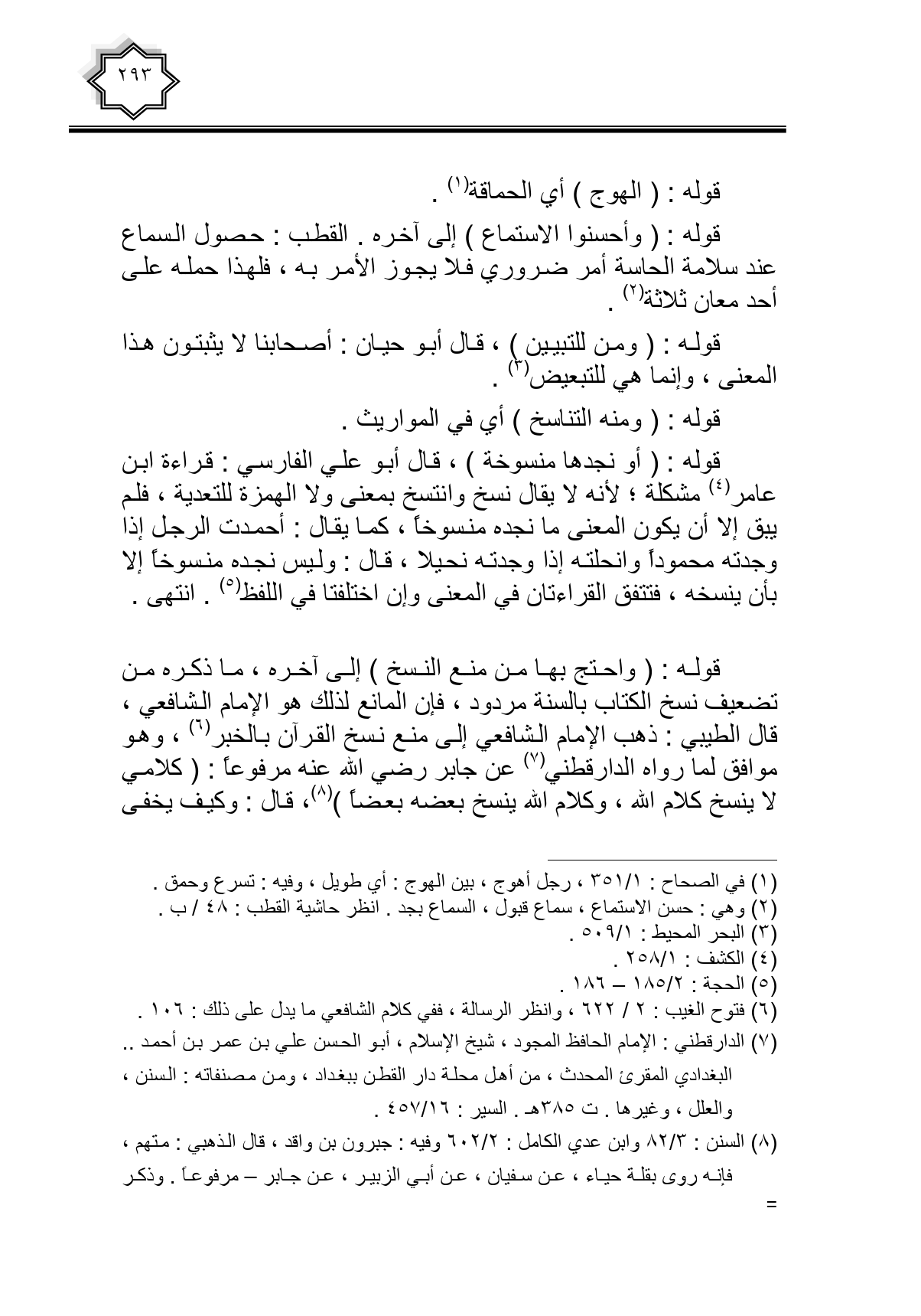 قوله: (واحتج بها من منع النسخ) إلي آخره، ما ذكره من تضعيف نسخ الكتاب بالسنة مردود، فإن المانع لذلك هو الإمام الشافعي، قال الطيبي: ذهب الإمام الشافعي إلى منع نسخ القرآن بالخبر، وهو موافق لما رواه الدارقطني عن جابر رضي الله عنه مرفوعا: (كلامي لا ينسخ كلام الله، وكلام الله ينسخ بعضه بعضا)، قال: رخيص يخفى