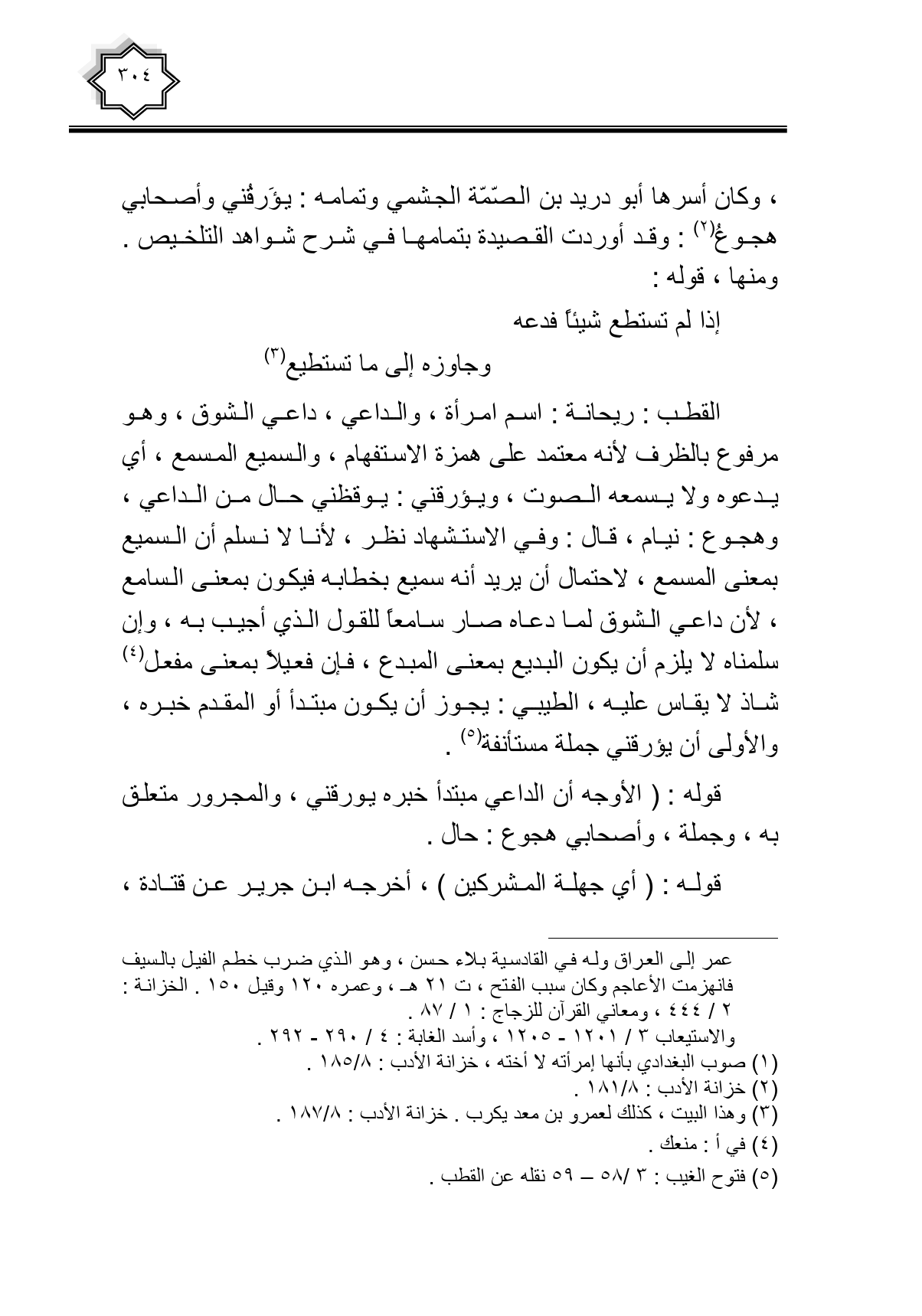 القطب: ريحانة: اسم امرأة، والداعي، داعي الشوق، وهو مرفوع بالظرف لأنه معتمد على همزة الاستفهام، والسميع المسمع، أي يدعوه ولا يسمعه الصوت، ويؤرقني: يوقظني حال من الداعي، وهجوع: نيام، قال: وفي الاستشهاد نظر، لأنا لا نسلم أن السميع بمعنى المسمع، لاحتمال أن يريد أنه سميع بخطابه فيكون بمعنى السامع، لأن داعي الشوق لما دعاه صار سامعا للقول الذي أجيب به، وإن سلمناه لا يلزم أن يكون البديع بمعنى المبدع، فإن فعيلا بمعنى مفعل شاذ لا يقاس عليه، الطيبي: يجوز أن يكون مبتدأ أو المقدم خبره، والأولى أن يؤرقني جملة مستأنفة.