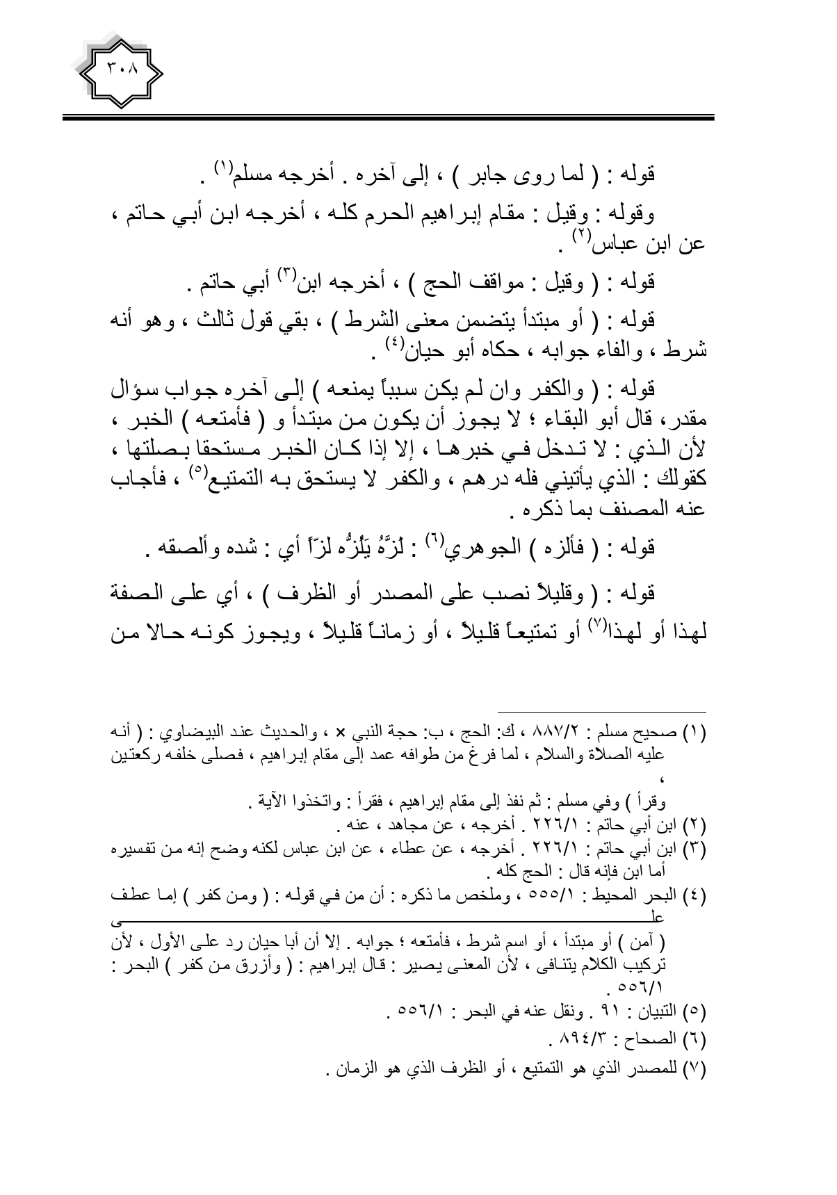 قوله: (والكفر وأن لم يكن سببا يمنعه) إلى آخره جواب سؤال مقدر، قال أبو البقاء؛ لا يجوز أن يكون من مبتدأ و (فأمتعه) الخبر، لأن الذي: لا تدخل في خبرها، إلا إذا كان الخبر مستحقا بصلتها، كقولك: الذي يأتيني فله درهم، والكفر لا يستحق به التمتيع، فأجاب عنه المصنف بما ذكره.
