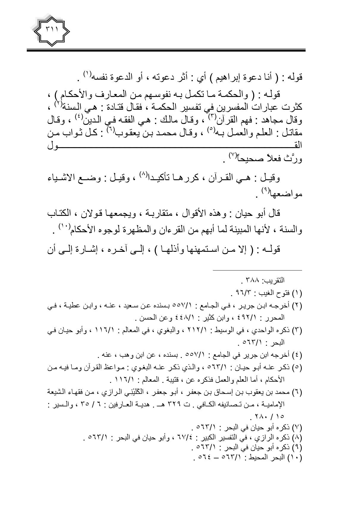 قال أبو حيان: وهذه الأقوال، متقاربة، ويجمعها قولان، الكتاب والسنة، لأنها المبينة لما أبهم من القرآن والمظهرة لوجوه الأحكام.